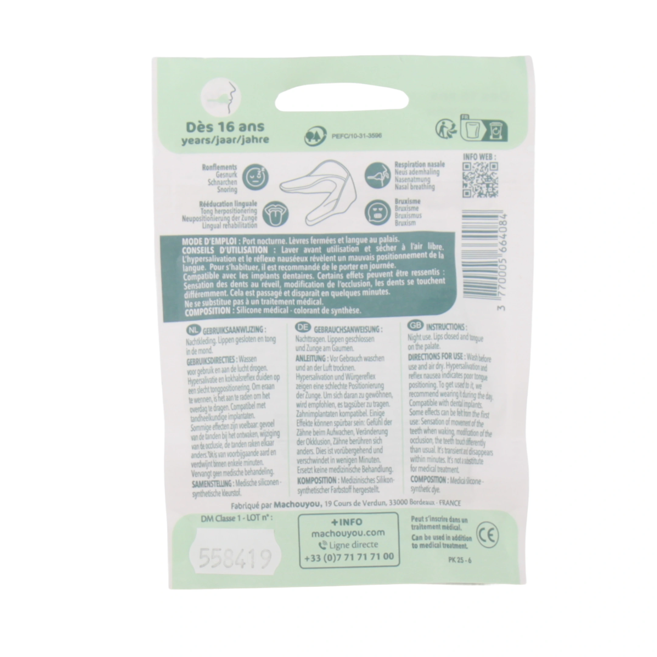 Machourelax est une gouttière dentaire de relaxation pour adultes à utiliser au cours de la nuit. Elle contribue à réduire les ronflements et à protéger du bruxisme chez l'adulte âgé de plus de 16 ans.