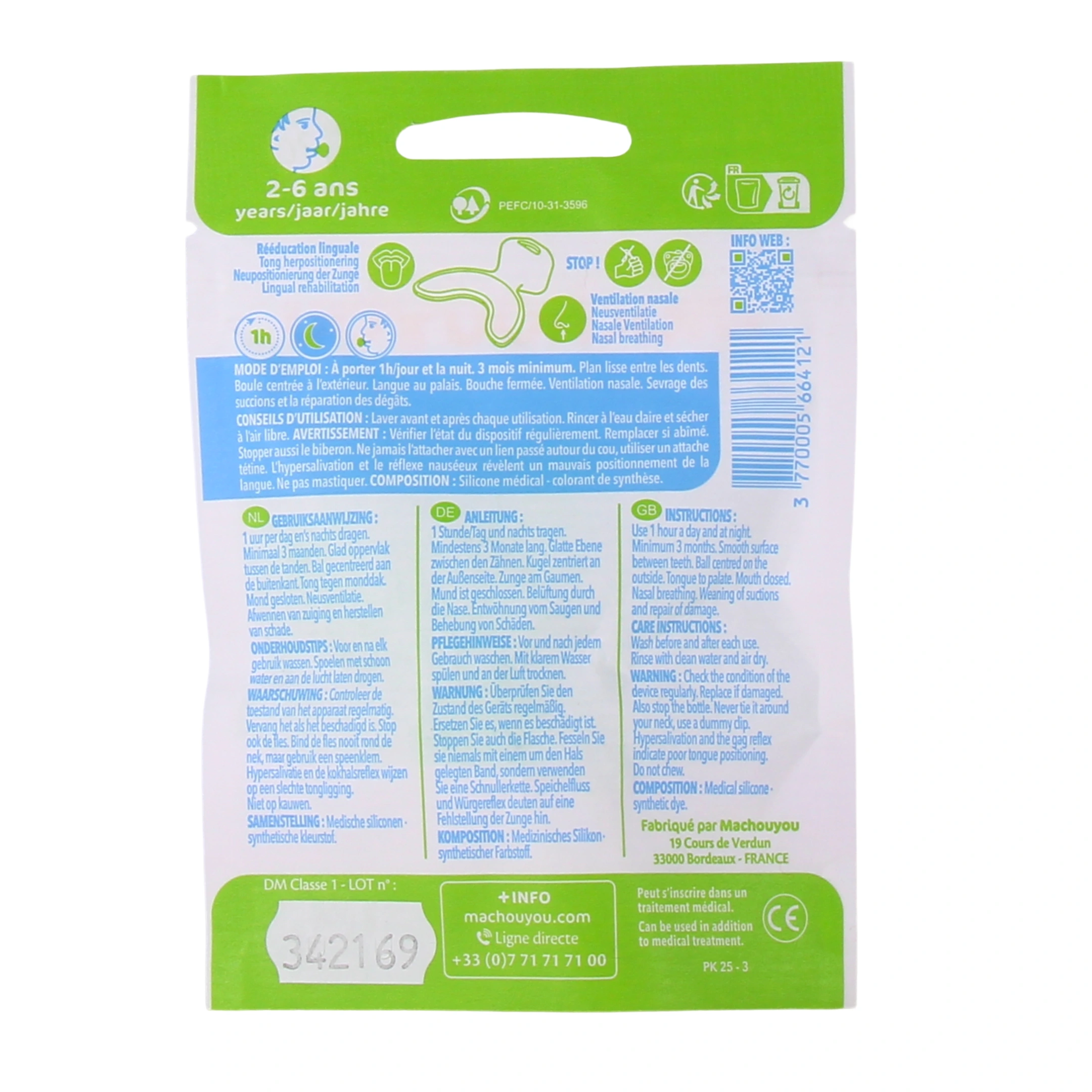 Quand un enfant suce une tétine ou son pouce, sa langue reste en position basse et ne peut pas se plaquer au palais pour permettre la déglutition naturelle. Au lieu de ça, elle exerce une poussée sur les dents, qui finissent par partir vers l'avant, provoquant une béance. Cet appui constant de la langue sur les dents peut aussi entraîner des problèmes d'élocution. Grâce à sa forme, le Machouyou permet un bon positionnement de la langue au palais, sans contact avec les dents. L'alignement dentaire est ainsi rétabli de manière progressive et en douceur.