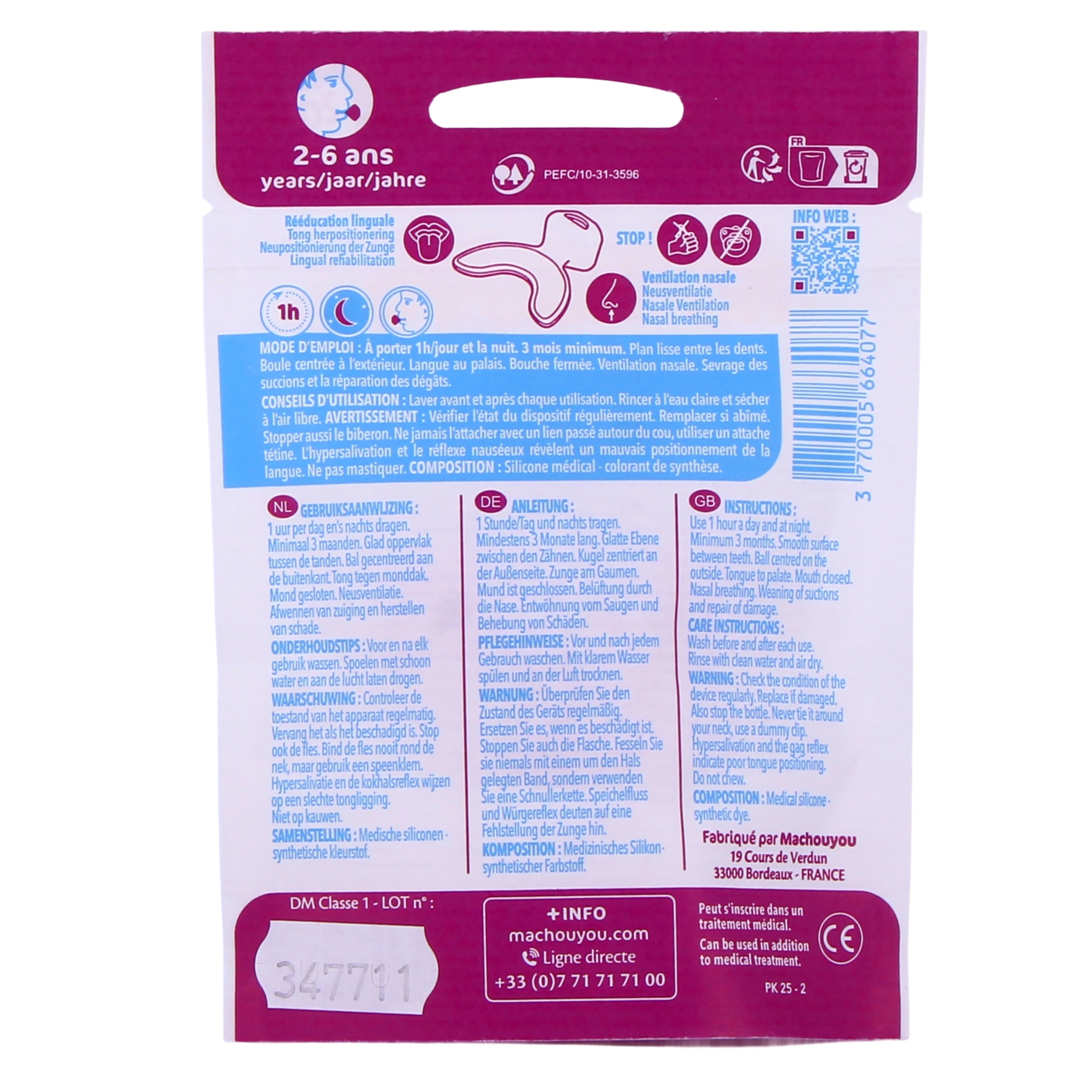 Quand un enfant suce une tétine ou son pouce, sa langue reste en position basse et ne peut pas se plaquer au palais pour permettre la déglutition naturelle. Au lieu de ça, elle exerce une poussée sur les dents, qui finissent par partir vers l'avant, provoquant une béance. Cet appui constant de la langue sur les dents peut aussi entraîner des problèmes d'élocution. Grâce à sa forme, le Machouyou permet un bon positionnement de la langue au palais, sans contact avec les dents. L'alignement dentaire est ainsi rétabli de manière progressive et en douceur.