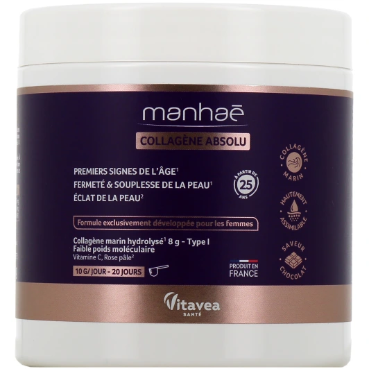 Le complément alimentaire Collagène Absolu a été mis au point par Manhaé pour aider à lutter contre le relâchement cutané, favoriser l'éclat, l'élasticité et la souplesse de la peau. Sa formule exclusivement développée pour les femmes de plus de 25 ans a pour but d'agir sur les premiers signes de l'âge et sur la peau grâce à du collagène marin hautement assimilable, de la vitamine C et de la poudre de pétales de rose.