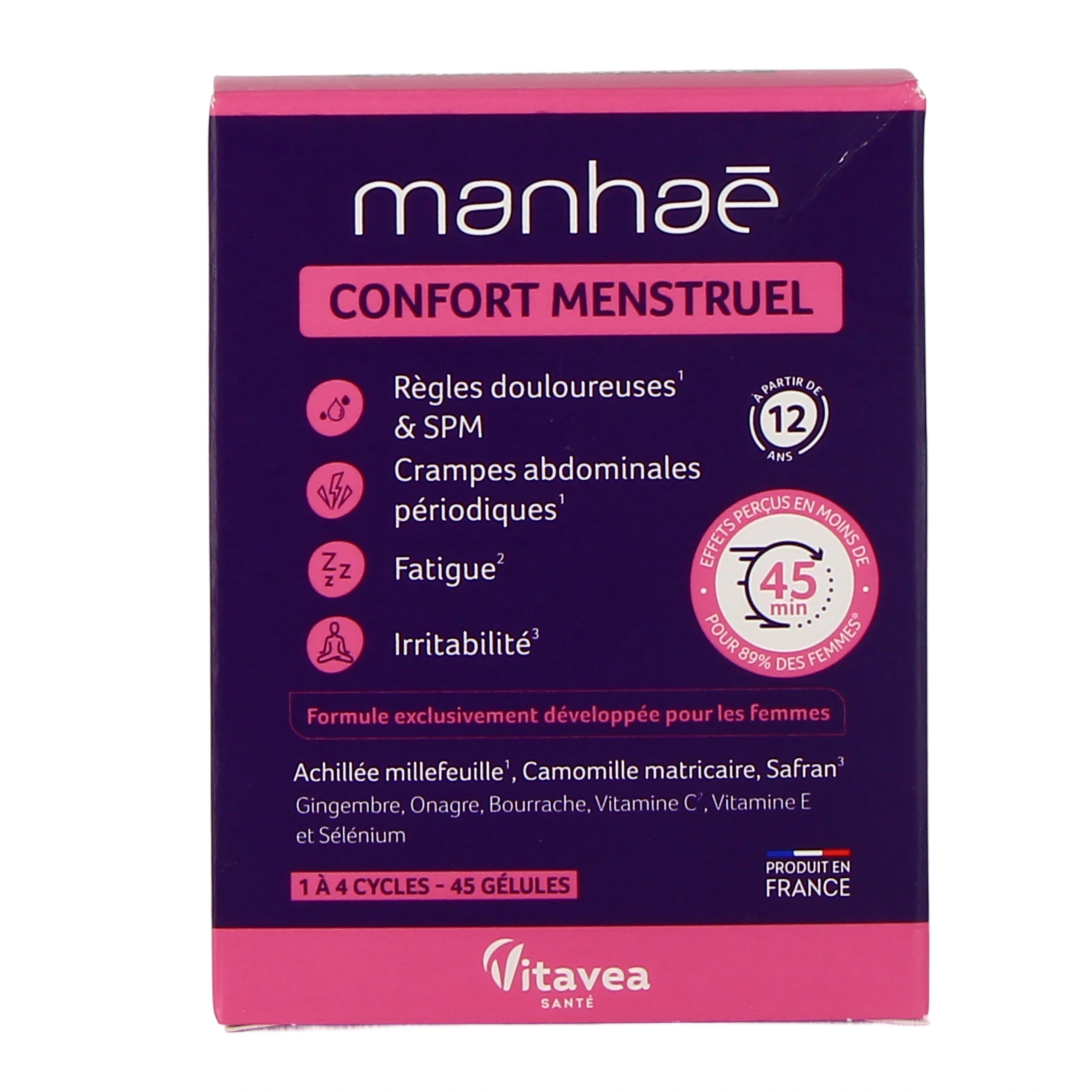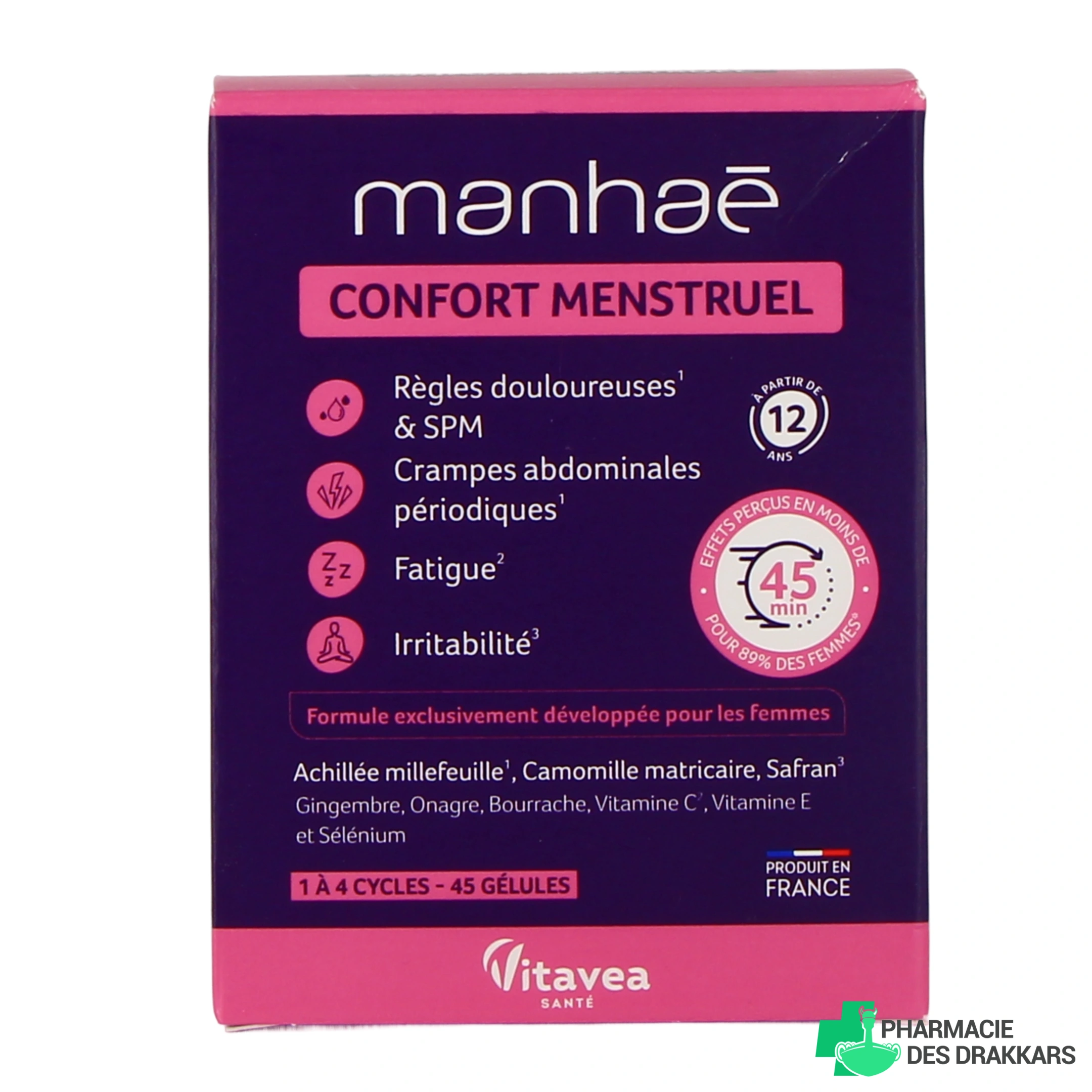 Conditionnement disponible sur notre pharmacie en ligne pour Manhaé Confort Menstruel : boîte de 45 gélules (pour 1 à 4 cycles).