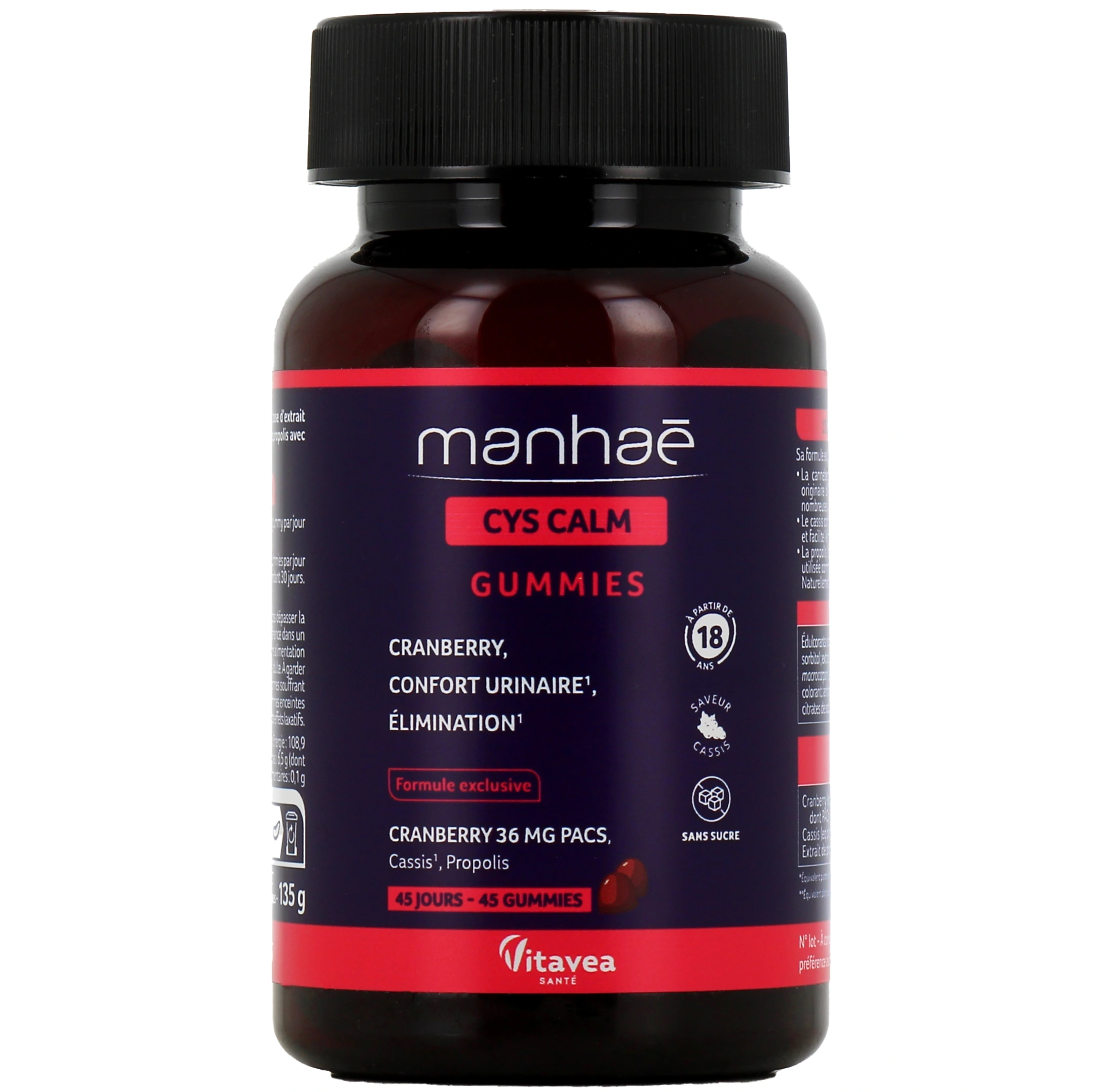 Manhaé Cys Calm est un complément alimentaire du laboratoire Viatavea Santé à base de cranberry, de cassis et de propolis, pour le confort urinaire et favoriser l'élimination.