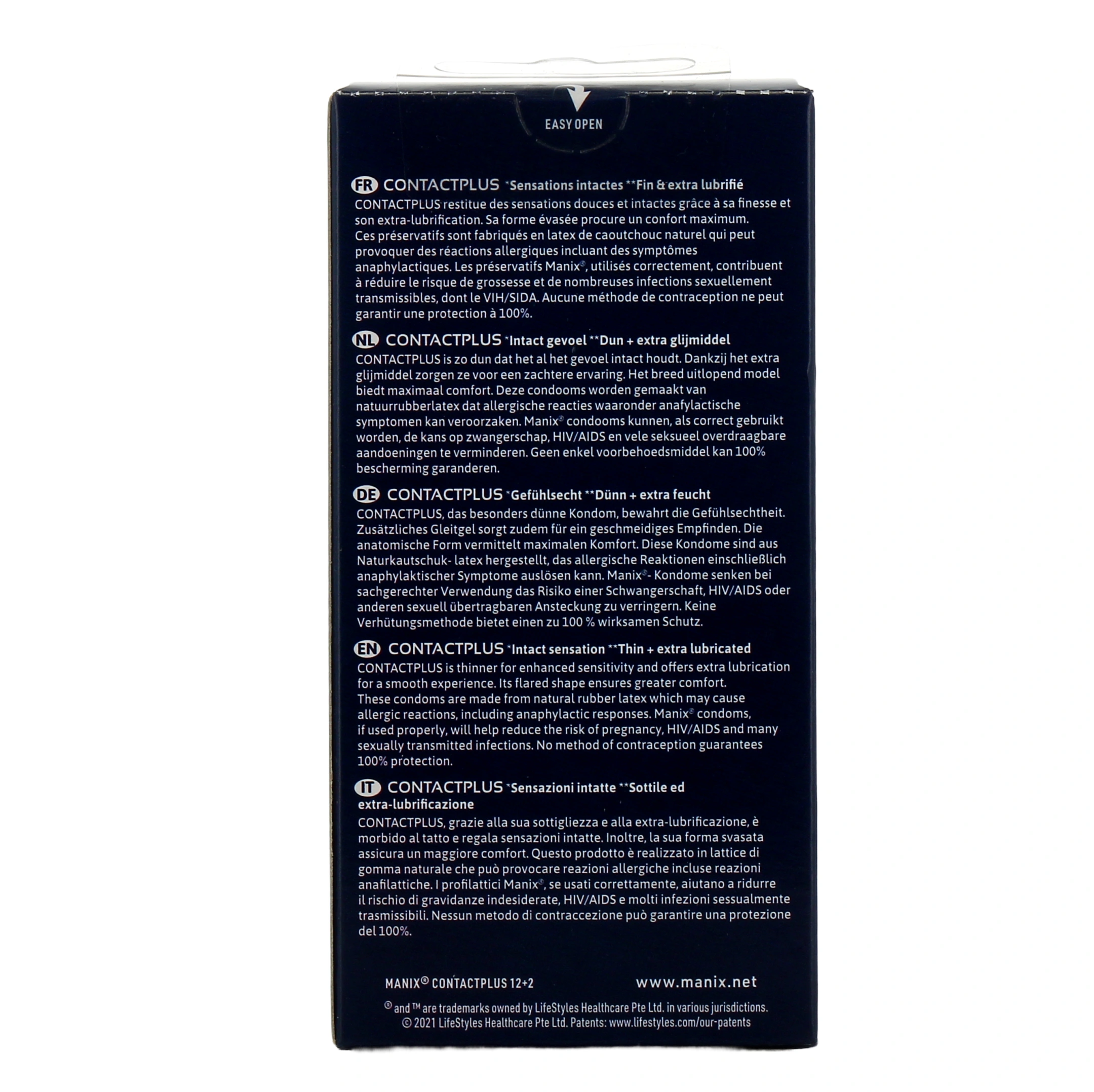 Présentations proposées pour les préservatifs Contact Plus Manix sur notre pharmacie en ligne : Boîte de 12 ou 24 préservatifs, ou boîte de 12 préservatifs + 2 offerts, sous réserve de disponibilité.