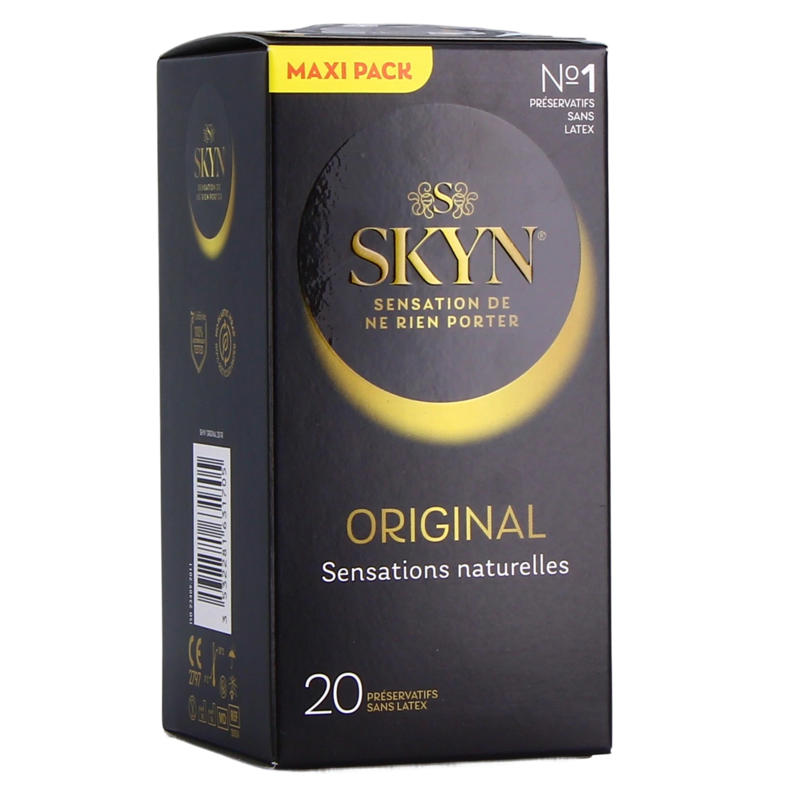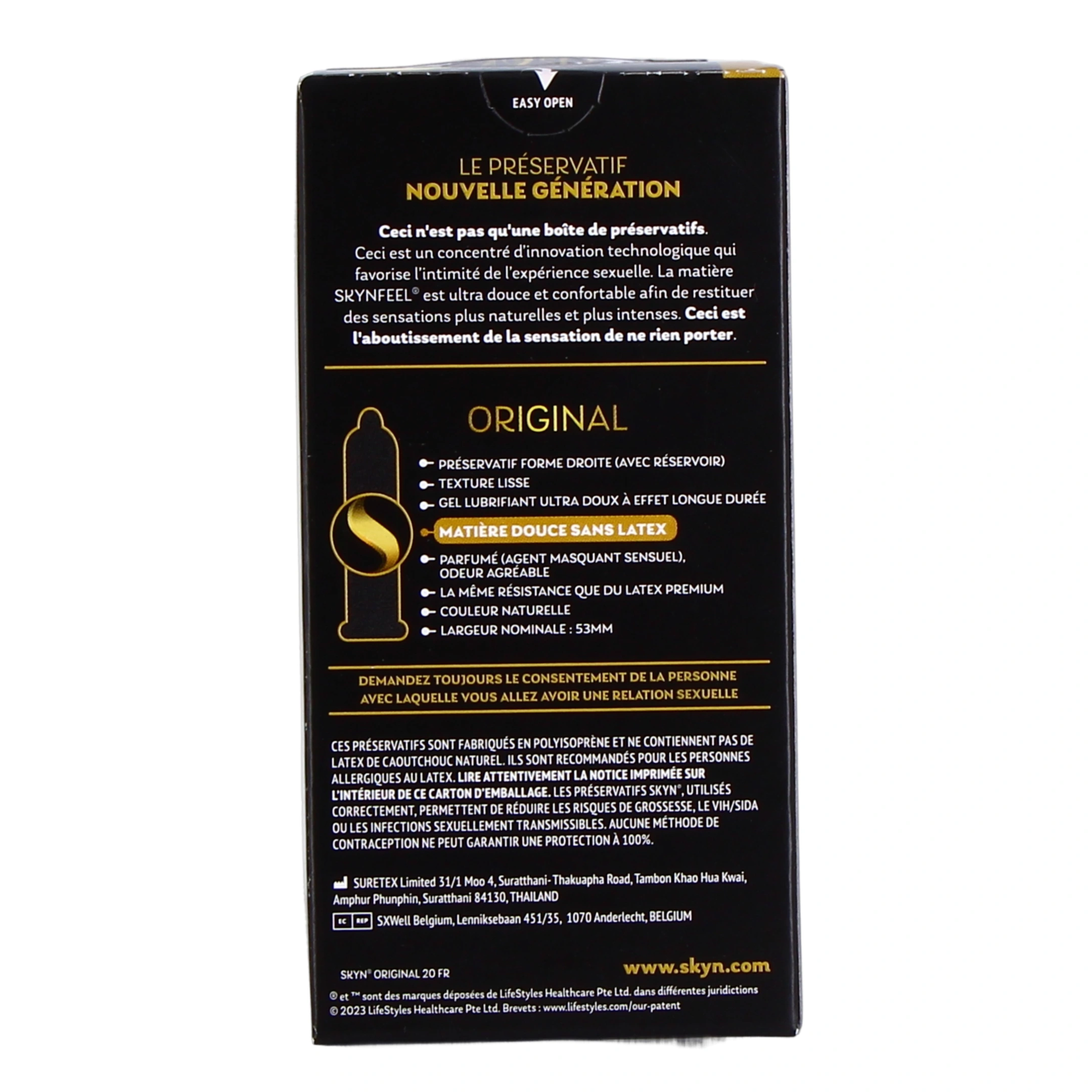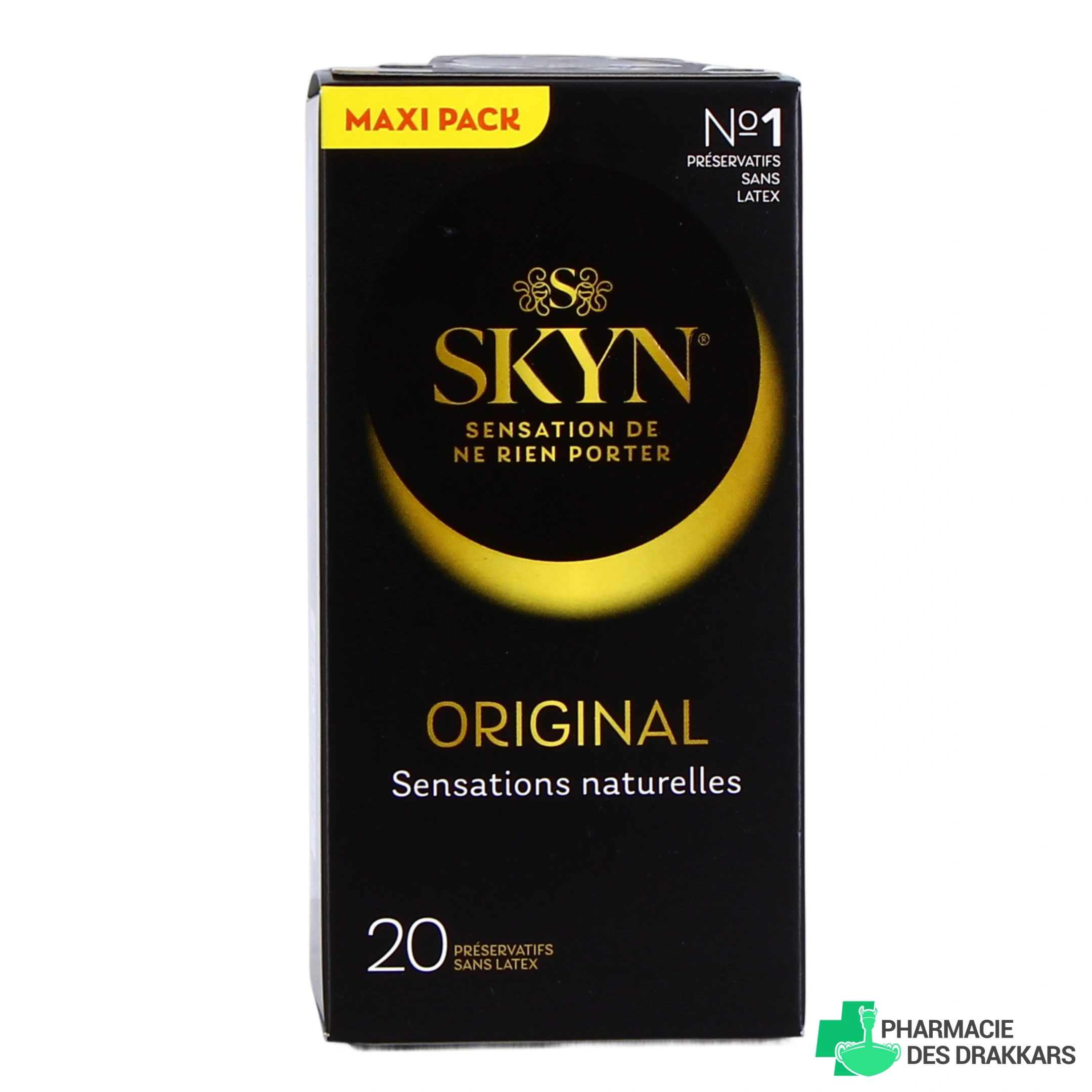 Conditionnement proposé par la Pharmacie des Drakkars pour les préservatifs Skyn Original Manix : Boîte de 10 ou de 20 préservatifs.