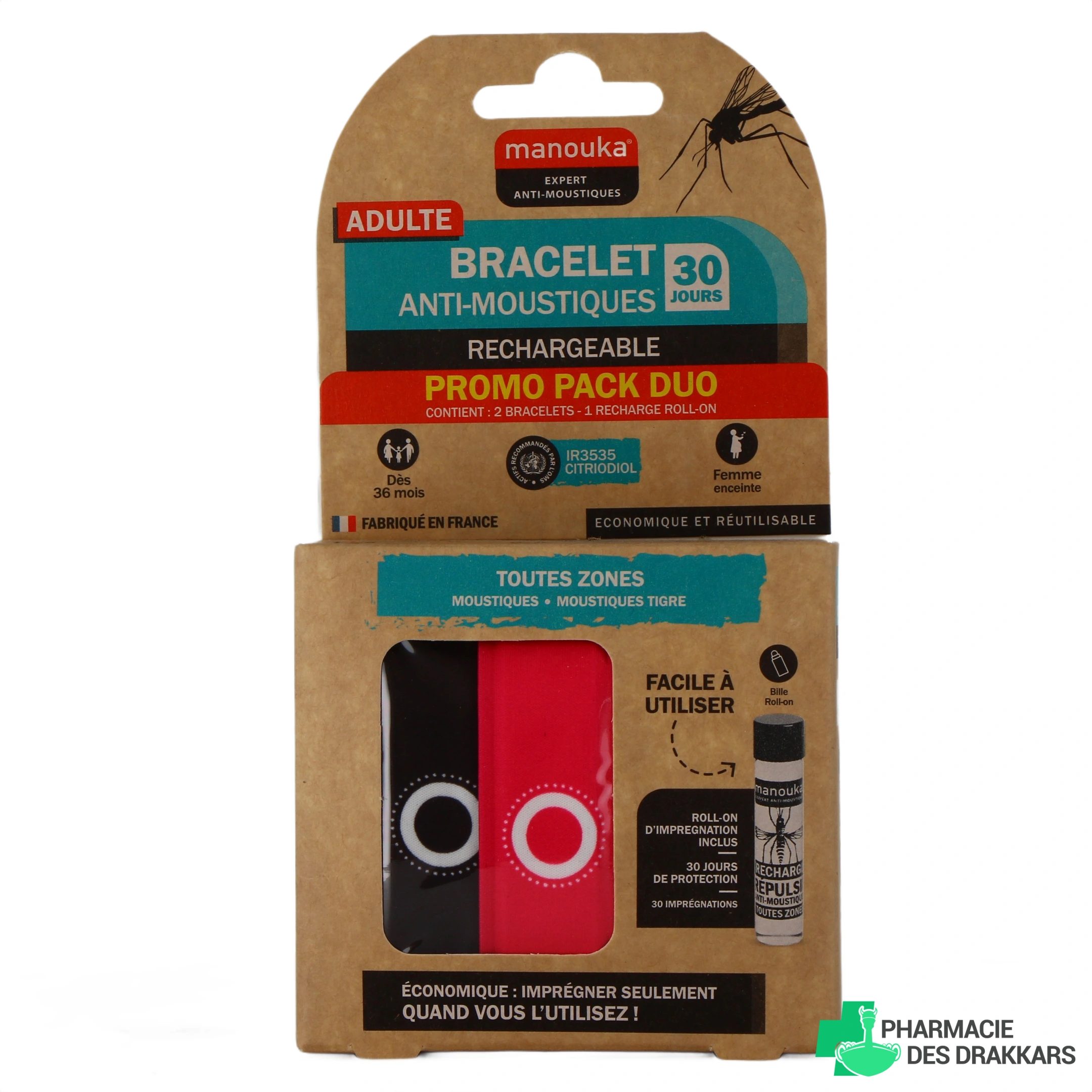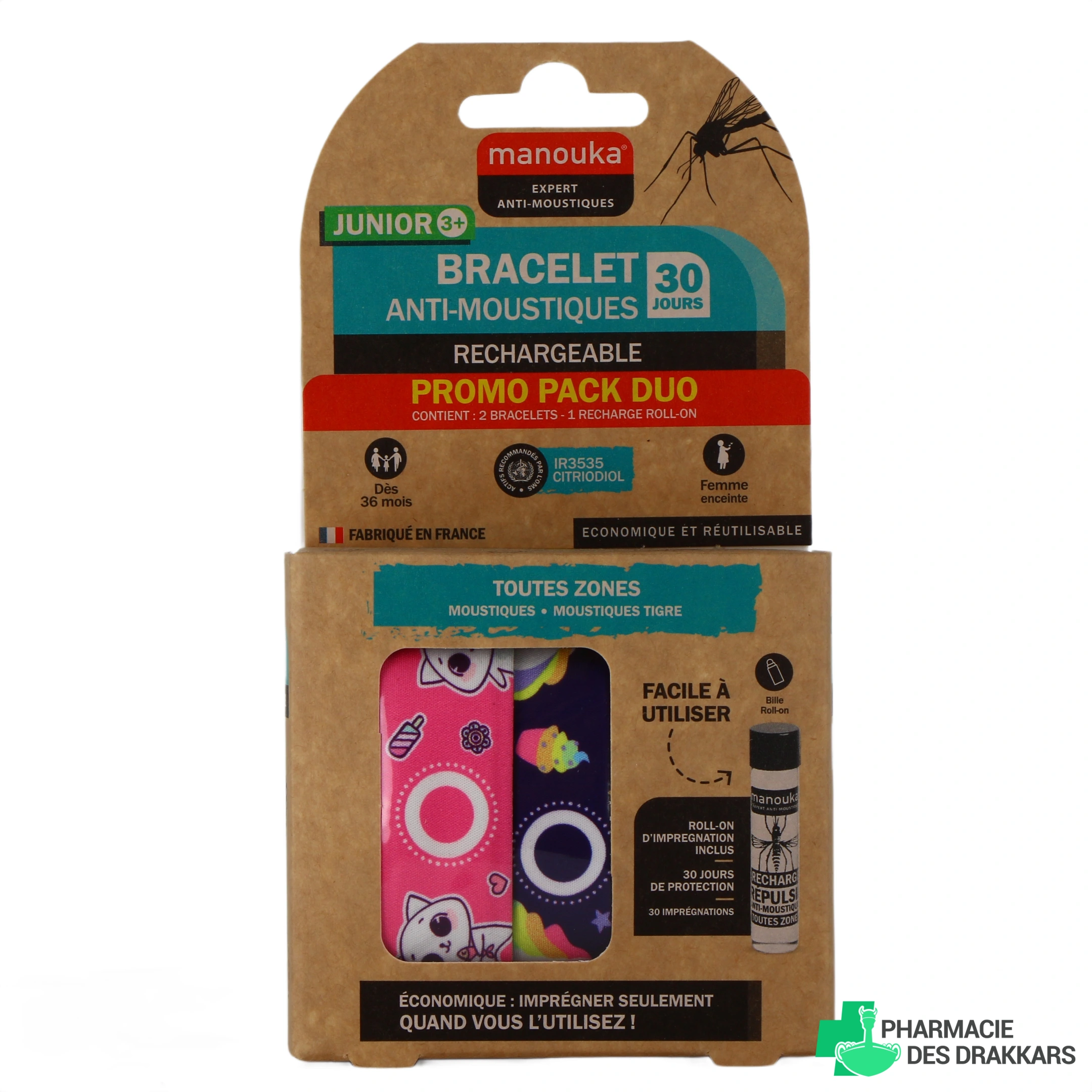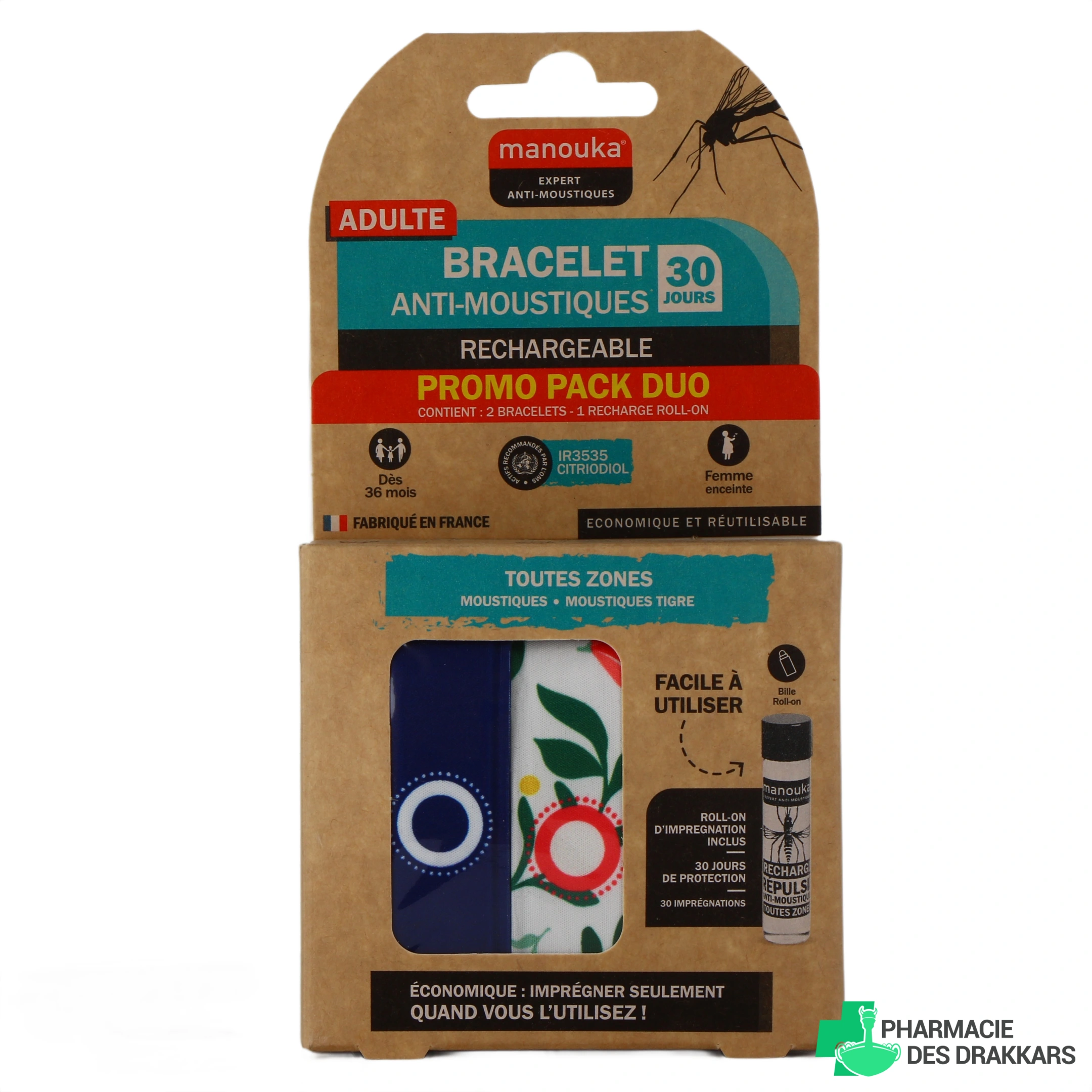 Conçu pour toutes les zones du globe (tempérées, tropicales, infestées), le bracelet anti-moustiques Manouka permet de repousser les moustiques, dont le moustique tigre, ainsi que les mouches. Soumis au test de la cage recommandé par l'OMS, il a prouvé son efficacité cliniquement : une fois en place, il protège le porteur pendant 6 heures dans un rayon d'1 mètre. Pour fonctionner correctement, le bracelet Manouka doit être imprégné d'une solution répulsive dont la formule repose sur un duo d'actifs traditionnellement employés pour formuler des anti-moustiques : l'IR3535 et le citriodiol.