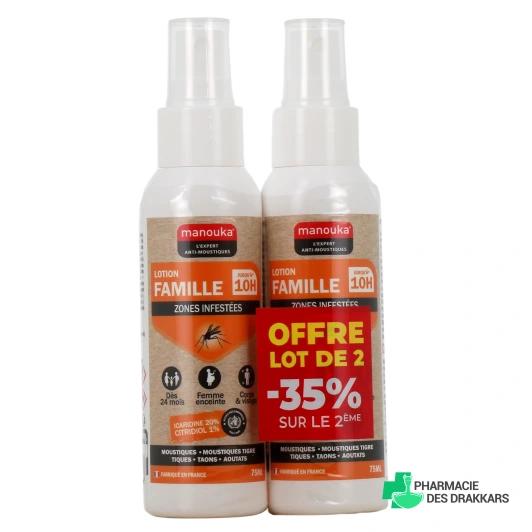Le spray répulsif anti-moustiques Manouka Famille est un dispositif efficace contre tous les moustiques, les moustiques tigres, les tiques, les mouches, les abeilles et les taons, et convenant pour toutes la famille, y compris les enfants dès 1 an.