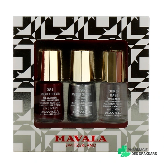 Regroupant 3 vernis à ongles de la marque Mavala, ce kit de manucure est parfait pour afficher des ongles festifs. Vous pourrez l'utiliser en vu de n'importe quelle occasion : soirée en amoureux, anniversaire, Noël... A l'intérieur du kit manucure Mavala, vous trouverez d'abord un vernis couleur proposant une variation autour du rouge. En effet, chaque kit propose une teinte de rouge spécifique, le plus dur sera donc de faire votre choix entre Madrid, London, Rococo Red et Rouge Forever.