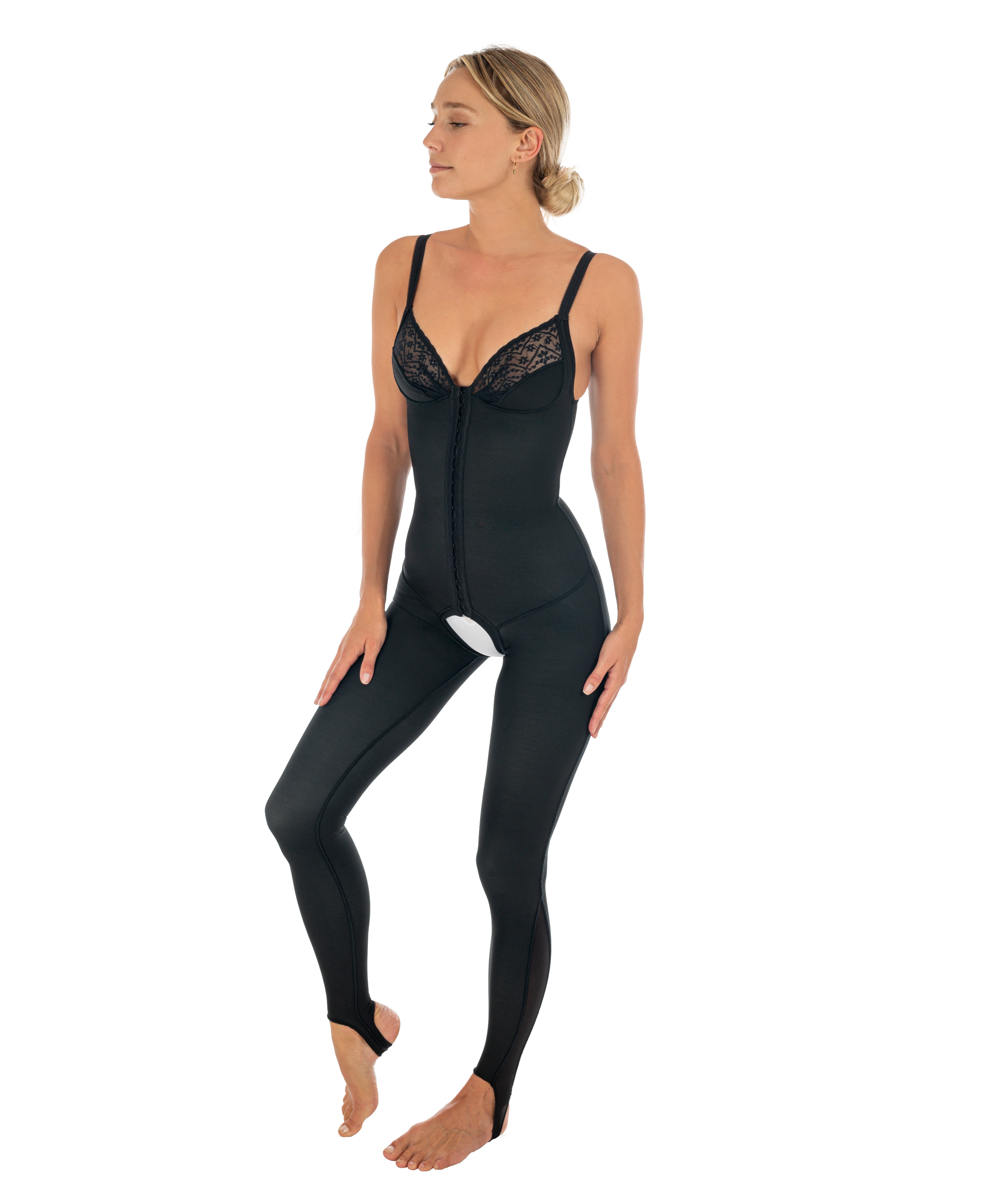 Le modèle Combi Elegance CoolMax Cheville EC010 Medical Z est muni d'un soutien gorge fait de dentelle avec des bretelles ajustables et amovibles et de deux rangées de fermetures avec agrafes afin de faciliter l'ajustement. Il est ouvert à l'entrejambe et est terminé avec un passant sous le pied.