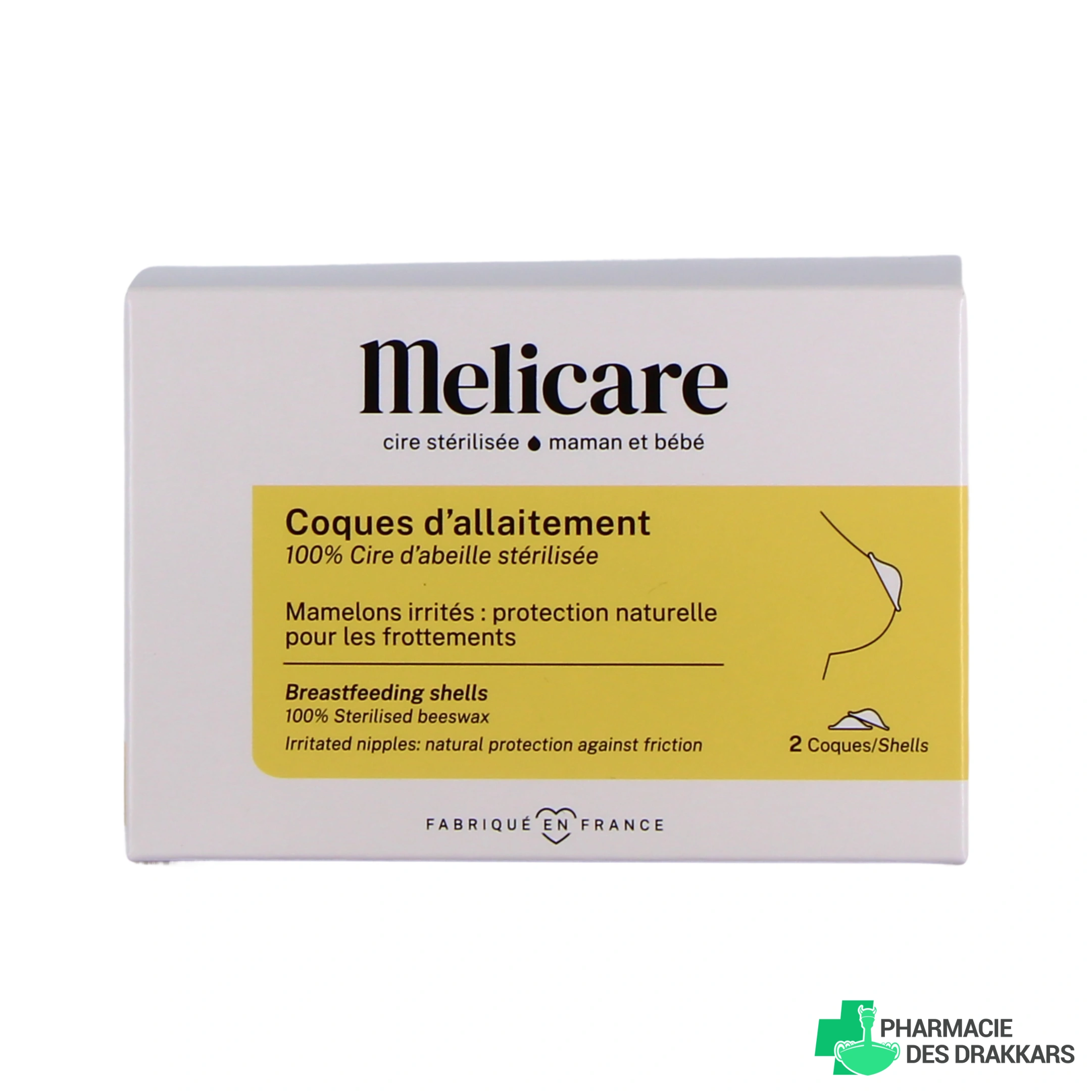 Présentation proposée par notre pharmacie en ligne pour les coques d'allaitement en cire d'abeille Melicare : boîte de 2 coques.