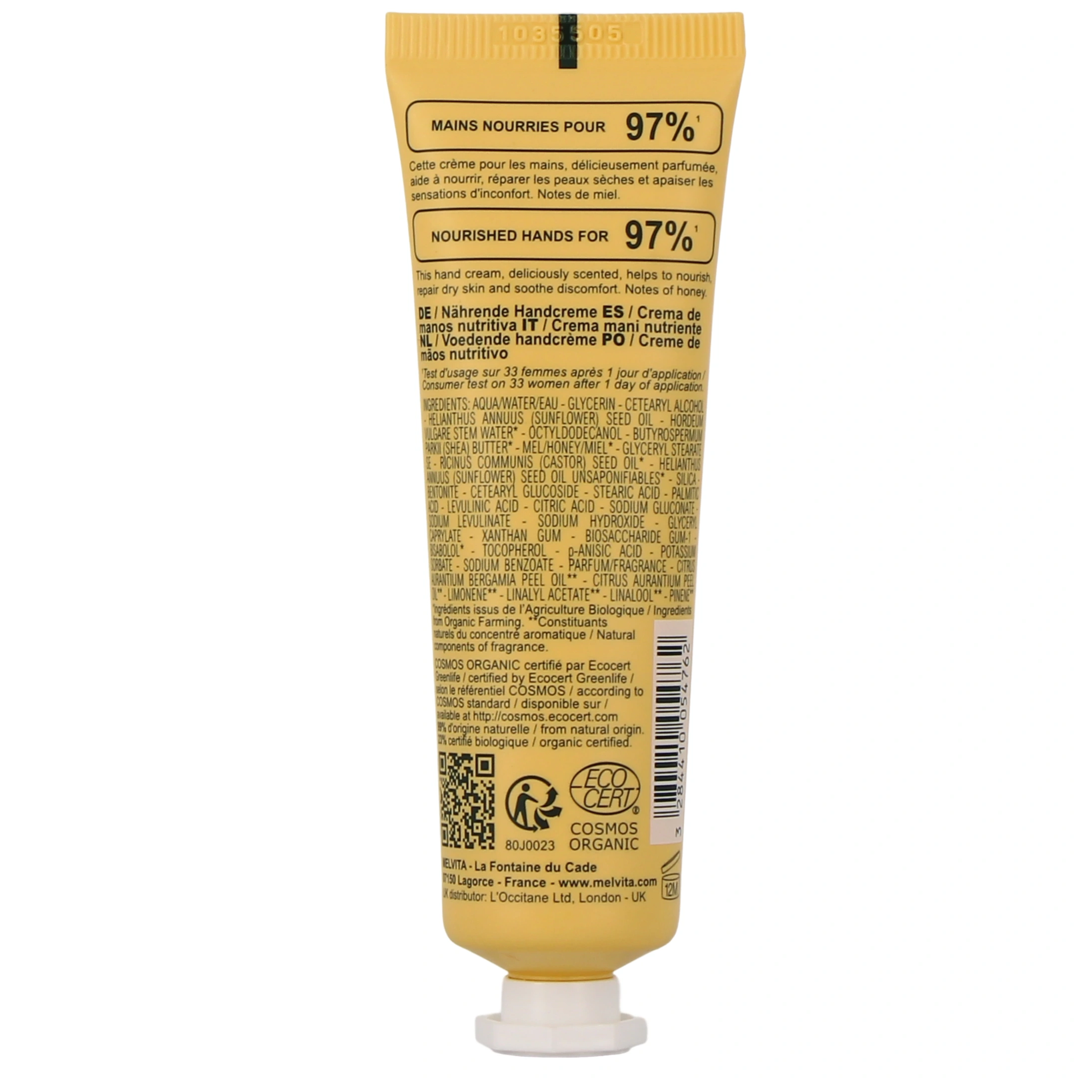 - Enrichie d'un complexe de 3 miels et en beurre de karité, la crème mains nourrissante miel nourrit et répare les peaux sèches. Sa texture riche et onctueuse apaise les mains sèches et abîmées et favorise une peau plus souple et confortable. Les mains sont parfumées d'une douce fragrance de miel ;