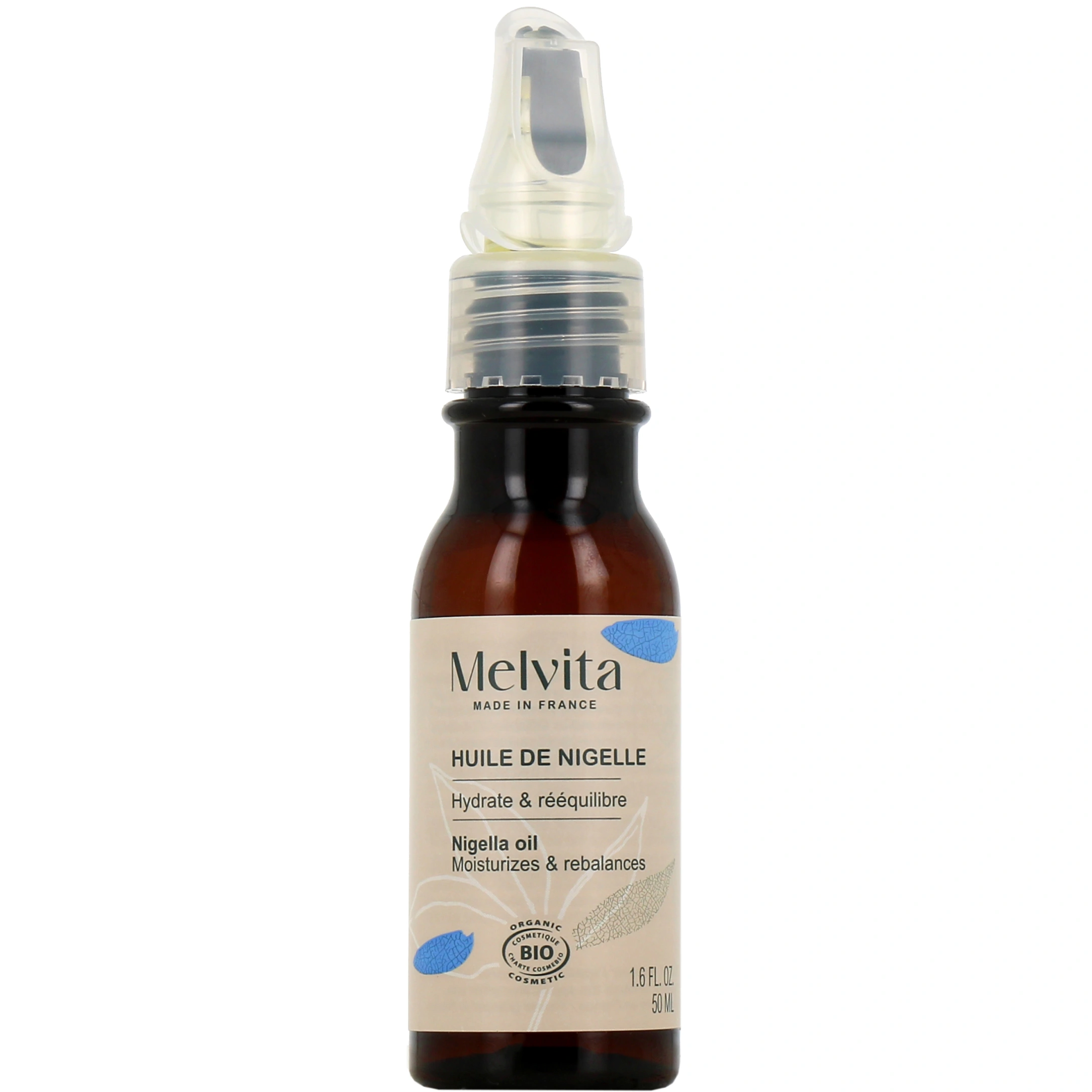 Conditionnement proposé par votre pharmacie en ligne : flacon plume de 50 ml d'huile de nigelle Melvita Bio.