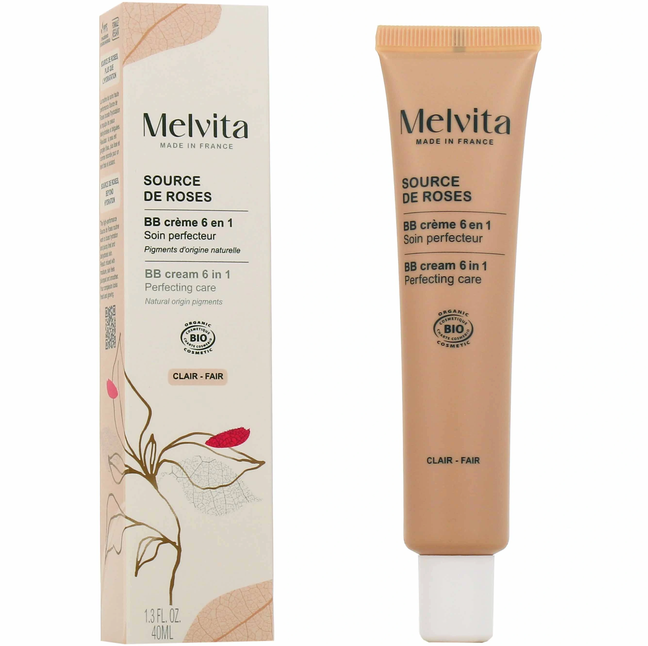 Conditionnement disponible sur notre pharmacie en ligne pour la BB crème 6 en 1 Melvita Source de Roses : Tube de 40 ml teinte claire ou teinte dorée.