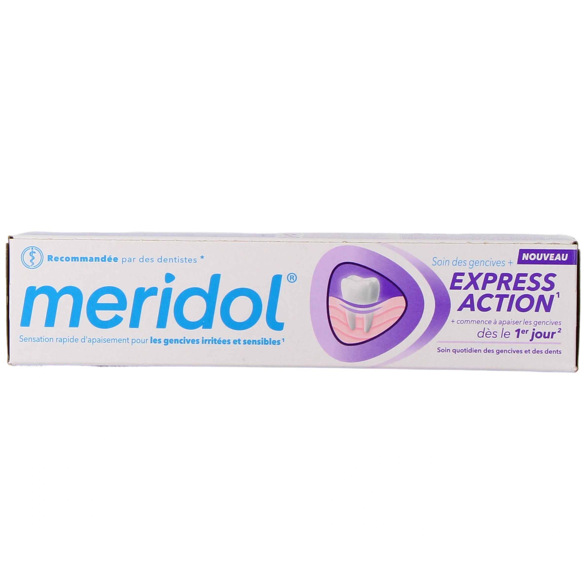Le dentifrice soin des gencives express action de Meridol est spécialement formulé pour apaiser rapidement les gencives irritées ou sensibles. Recommandé par des dentistes, il agit dès le premier jour pour combattre la plaque dentaire, principale cause des problèmes gingivaux. Sa formule double action aide à réduire le saignement occasionnel, l'inflammation et la sensibilité. Jour après jour, il protège durablement les gencives tout en prenant soin des dents.