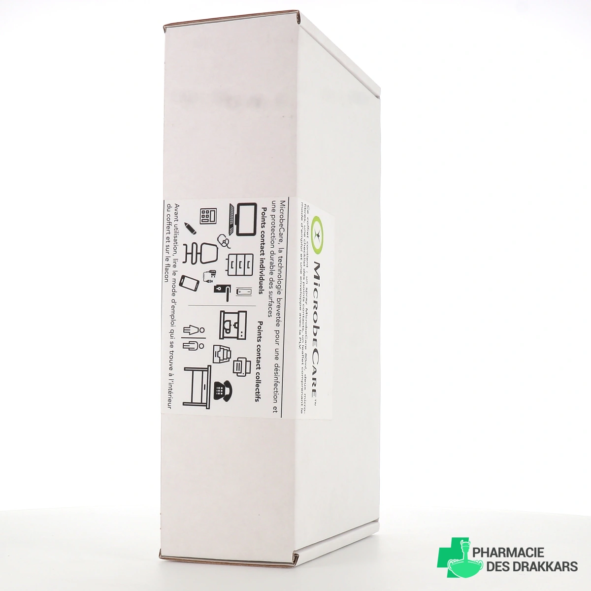 Formulé avec une technologie unique, le Spray désinfectant Microbecare a pour vocation d'agir contre 99,99% des virus, bactéries, levures, moisissures et champignons qui sont susceptibles d'infecter vos différentes surfaces. Il protège les objets en formant un filmogène uniforme qui prévient le vieillissement des objets et qui élimine les micro-organismes grâce à un système d'électrocution par échange d'ions. Cette solution biocide est uniquement destinée à être appliquée sur des surfaces non poreuses, et ne doit pas entrer en contact avec les aliments ou avec les espaces de travail vétérinaires. Sa formulation unique permet de bénéficier de 12 mois d'efficacité en continu en réalisant seulement une application, à condition que celle-ci soit effectuée conformément aux conditions d'utilisation.