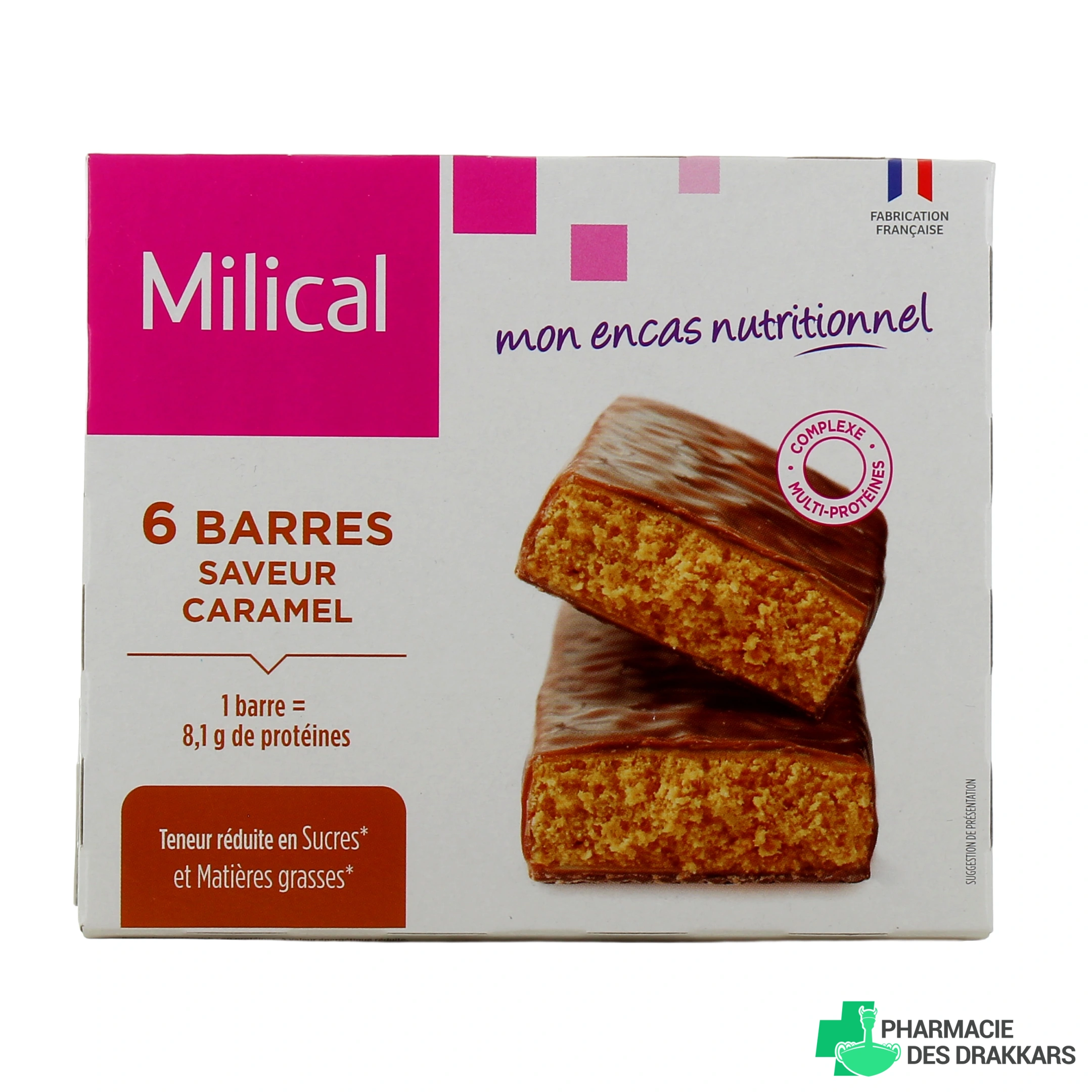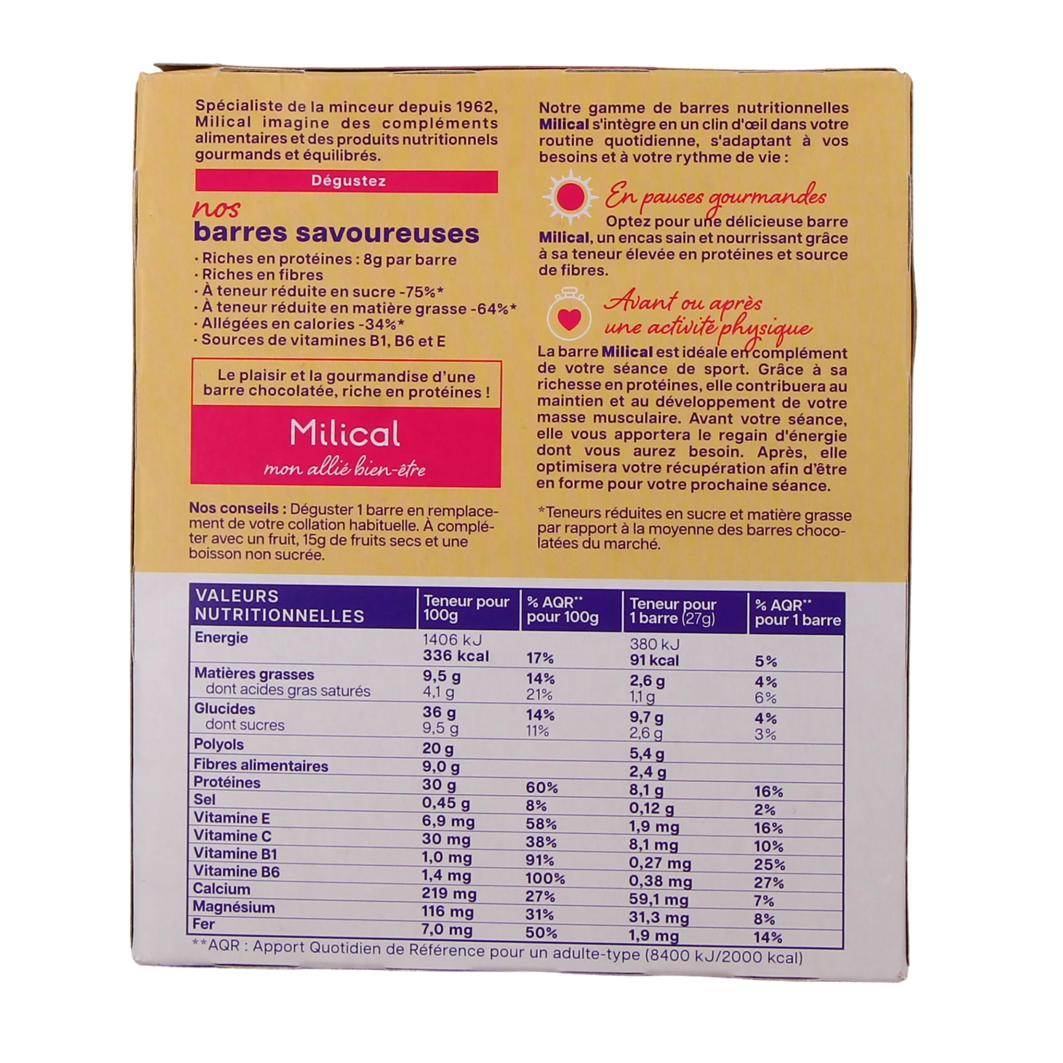 Chocolat Caramel : chocolat au lait de couverture 18% (sucre, beurre de cacao, lait écrémé en poudre, lactosérum en poudre, pâte de cacao, matière grasse de lait, émulsifiant : lécithines de soja, arôme naturel de vanille), stabilisant : sorbitols, gluten de blé, protéines de soja (lécithines de soja), polydextrose, édulcorant : maltitols, protéines de lait, dextrine de blé liquide, stabilisant : glycérol d'origine végétale, blanc d'œuf en poudre, huile de colza, arôme, minéraux (magnésium, fer), cacao maigre en poudre, vitamines (C, E, B6, B1), édulcorant : acésulfame-K.
