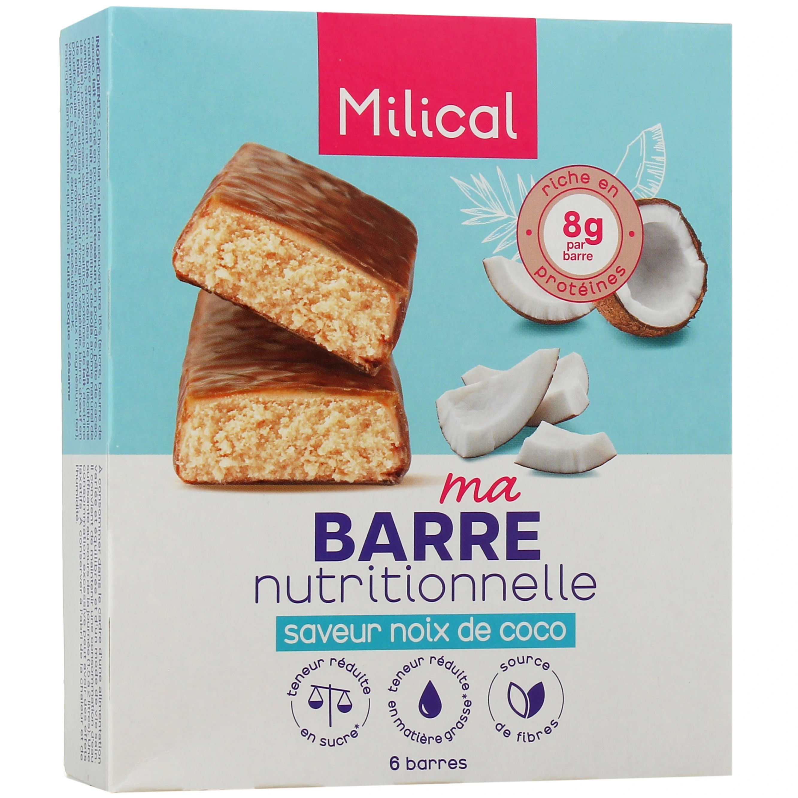 Chocolat Coco : chocolat au lait de couverture 18% (sucre, beurre de cacao, lait écrémé en poudre, lactosérum en poudre, pâte de cacao, matière grasse de lait, émulsifiant : lécithines de soja, arôme naturel de vanille), stabilisant : sorbitols, gluten de blé, protéines de soja (lécithines de soja), polydextrose, édulcorant : maltitols, protéines de lait, dextrine de blé liquide, stabilisant : glycérol d'origine végétale, blanc d'œuf en poudre, huile de colza, arôme, minéraux (magnésium, fer), cacao maigre en poudre, vitamines (C, E, B6, B1), édulcorant : acésulfame-K.