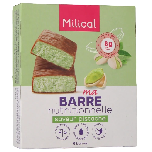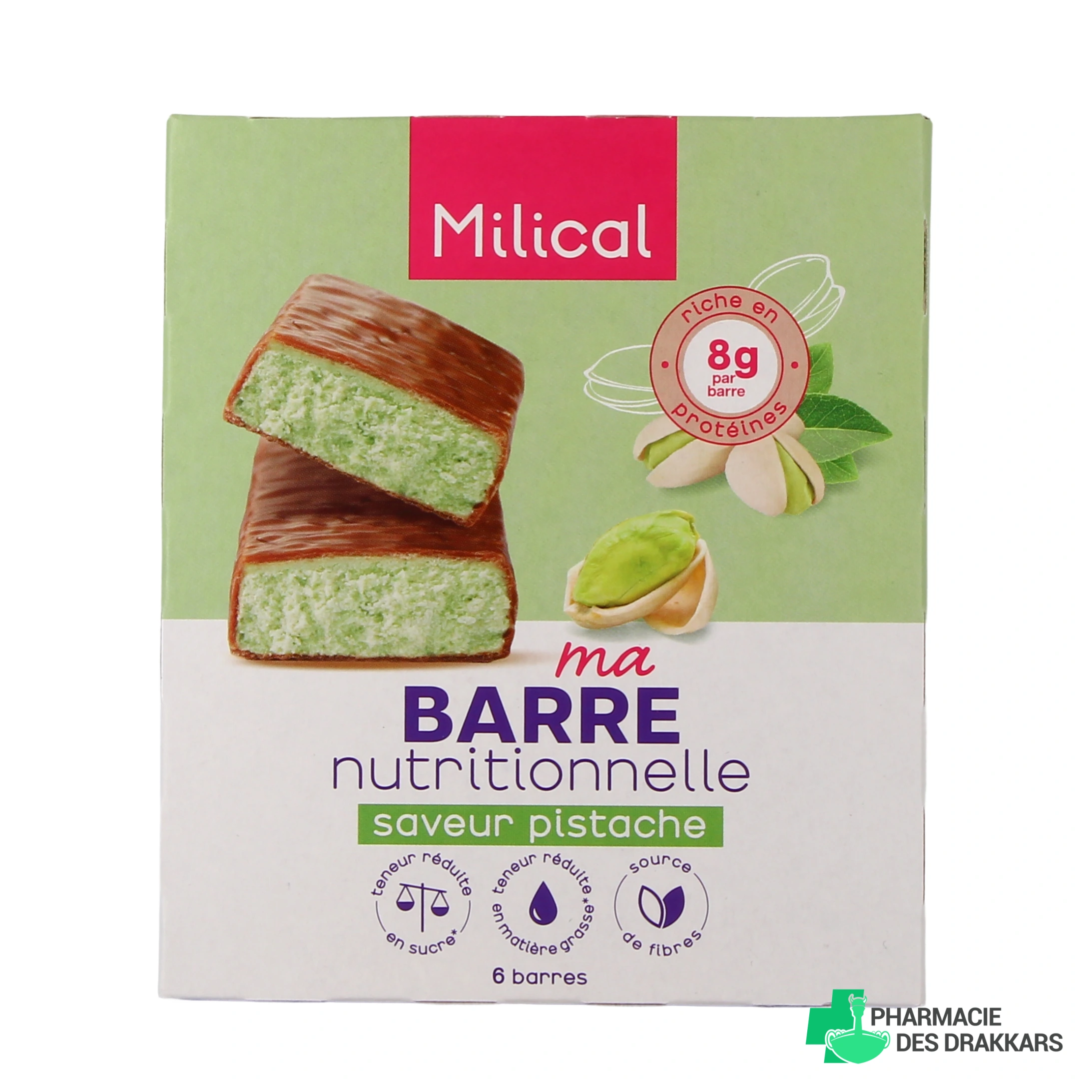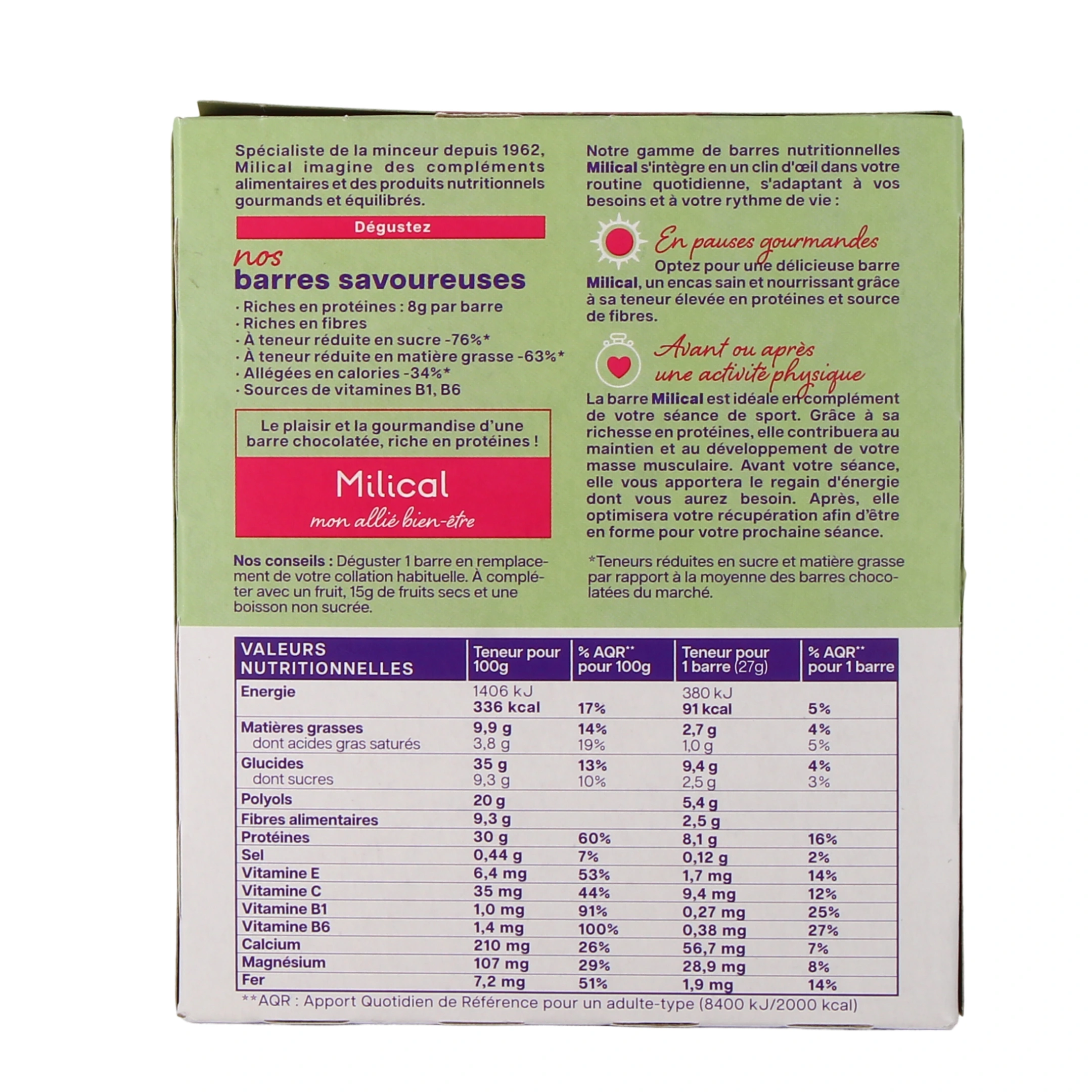 Chocolat Pistache : chocolat au lait de couverture 18% (sucre, beurre de cacao, lait écrémé en poudre, lactosérum en poudre, pâte de cacao, matière grasse de lait, émulsifiant : lécithines de soja, arôme naturel de vanille), stabilisant : sorbitols, gluten de blé, protéines de soja (lécithines de soja), polydextrose, édulcorant : maltitols, protéines de lait, dextrine de blé liquide, stabilisant : glycérol d'origine végétale, blanc d'œuf en poudre, huile de colza, arôme, minéraux (magnésium, fer), cacao maigre en poudre, vitamines (C, E, B6, B1), édulcorant : acésulfame-K.