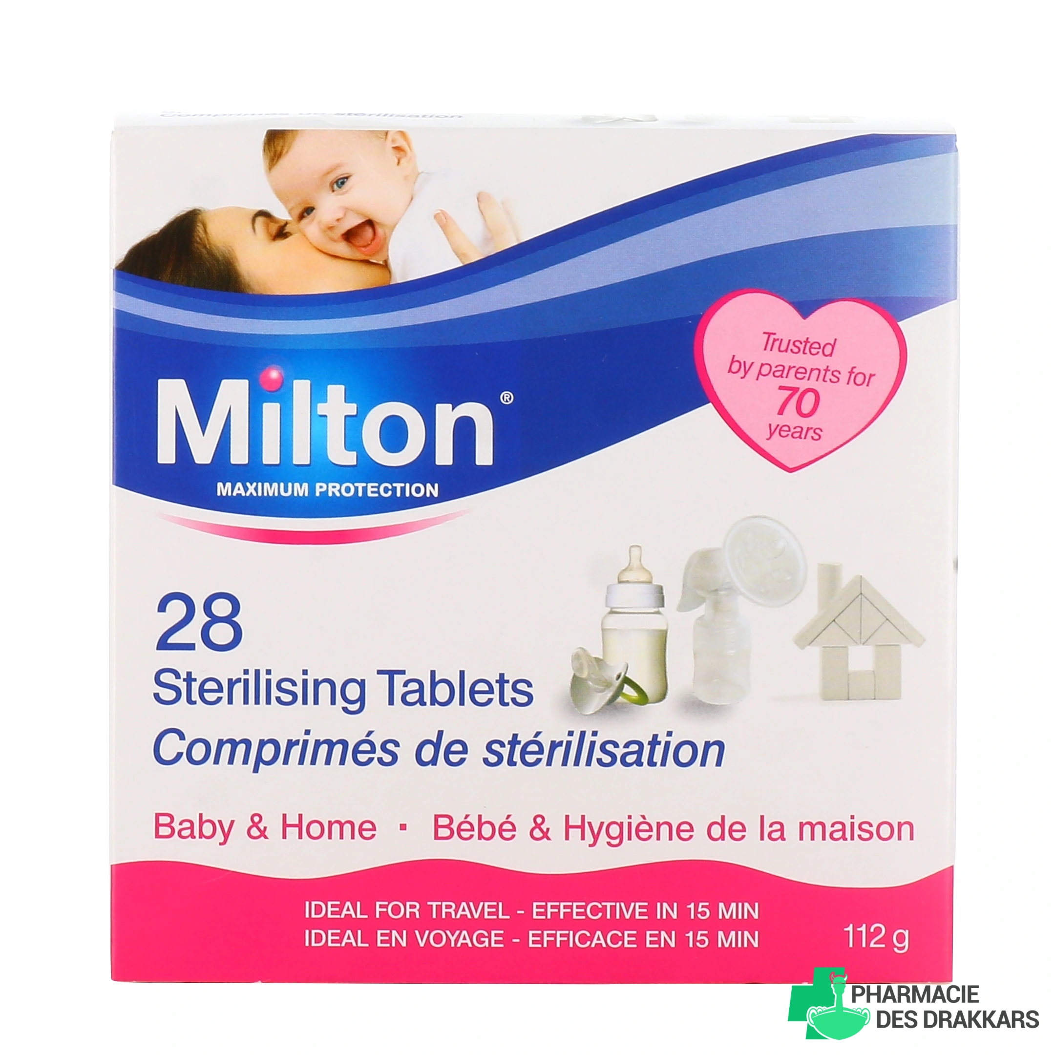 Présentation disponible pour les comprimés de stérilisation Milton sur notre pharmacie en ligne : Boîte de 28 comprimés