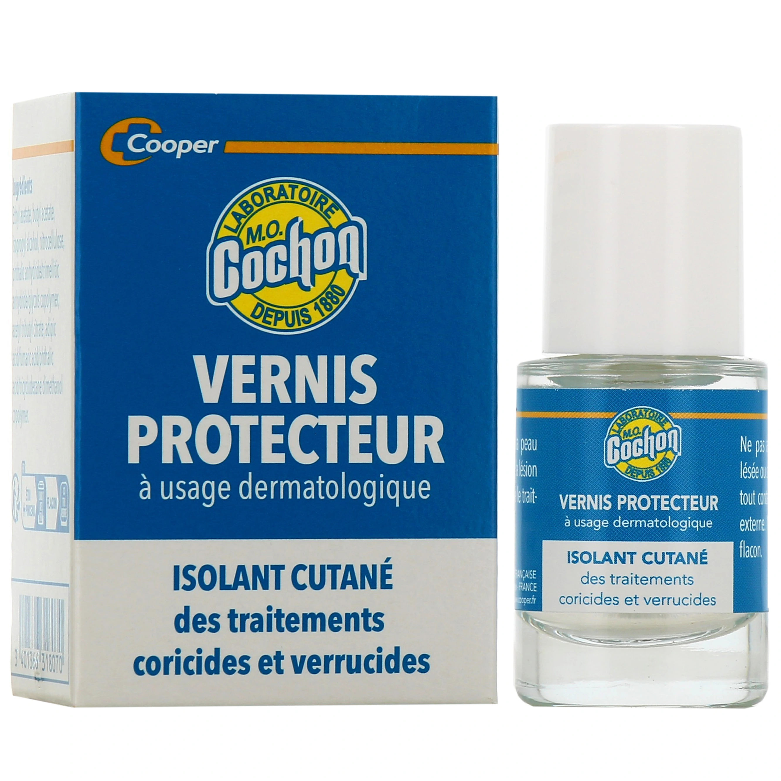 Le Vernis protecteur M.O. Cochon est un produit cosmétique à usage dermatologique qui fait figure d'isolant cutané dans l'optique de faciliter et de sécuriser les traitements des cors et des verrues.
