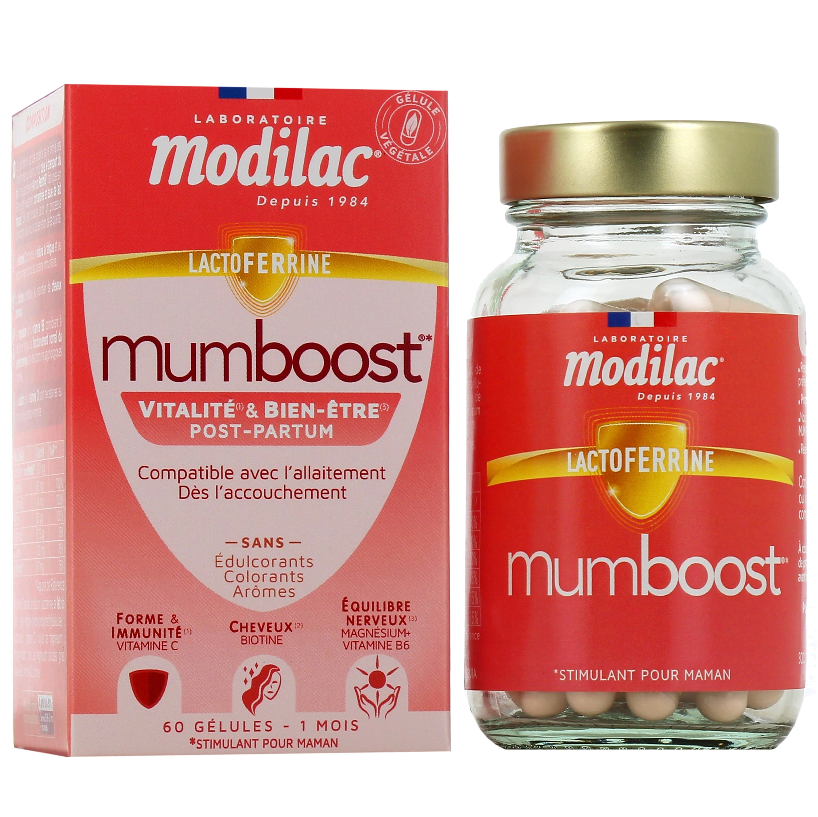 L'accouchement et les mois qui suivent la naissance d'un bébé mettent le corps et l'organisme des femmes à rude épreuve. Le Laboratoire Modilac pense que prendre soin des mamans est essentiel pour leur bien-être et celui de leur bébé. C'est pourquoi il a conçu Mumboost. La formule contient des ingrédients soigneusement sélectionnés pour votre bien-être, et vous aider à profiter plus sereinement de votre maternité. Ainsi, Mumboost agit sur 3 éléments : forme et immunité, cheveux et équilibre nerveux.