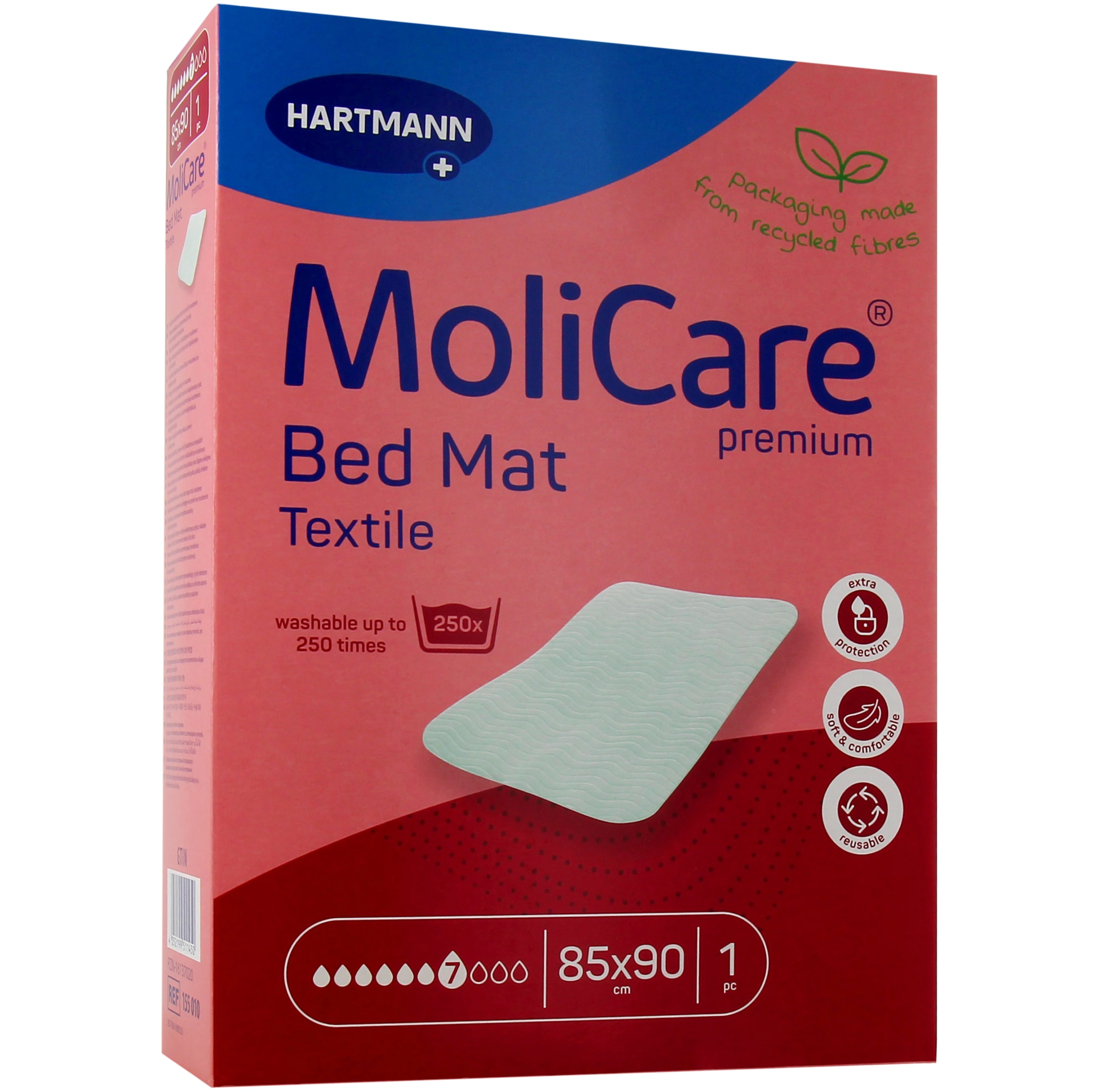 MoliCare Premium Bed Mat Textile 7 gouttes est une alèse de lit lavable et réutilisable conçue par le laboratoire Hartmann, fabriquée dans un textile non-tissé, et recommandé pour les personnes souffrant d'incontinence.