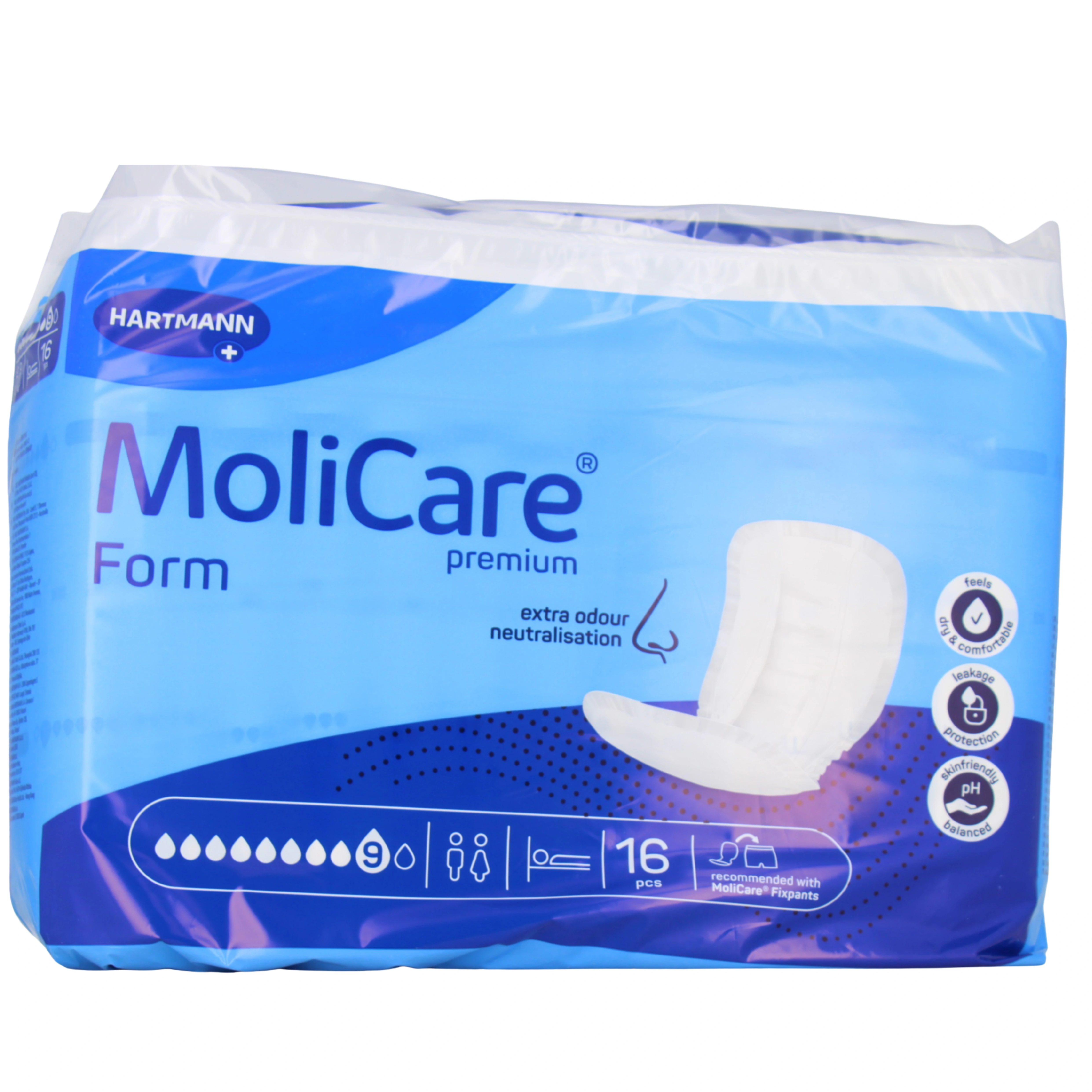 Vous pourrez retrouver les protections anatomiques Molicare Premium Form d'Hartmann dans les présentations suivantes sur notre pharmacie en ligne : niveau de protection 9 gouttes – sachet de 16 protections.