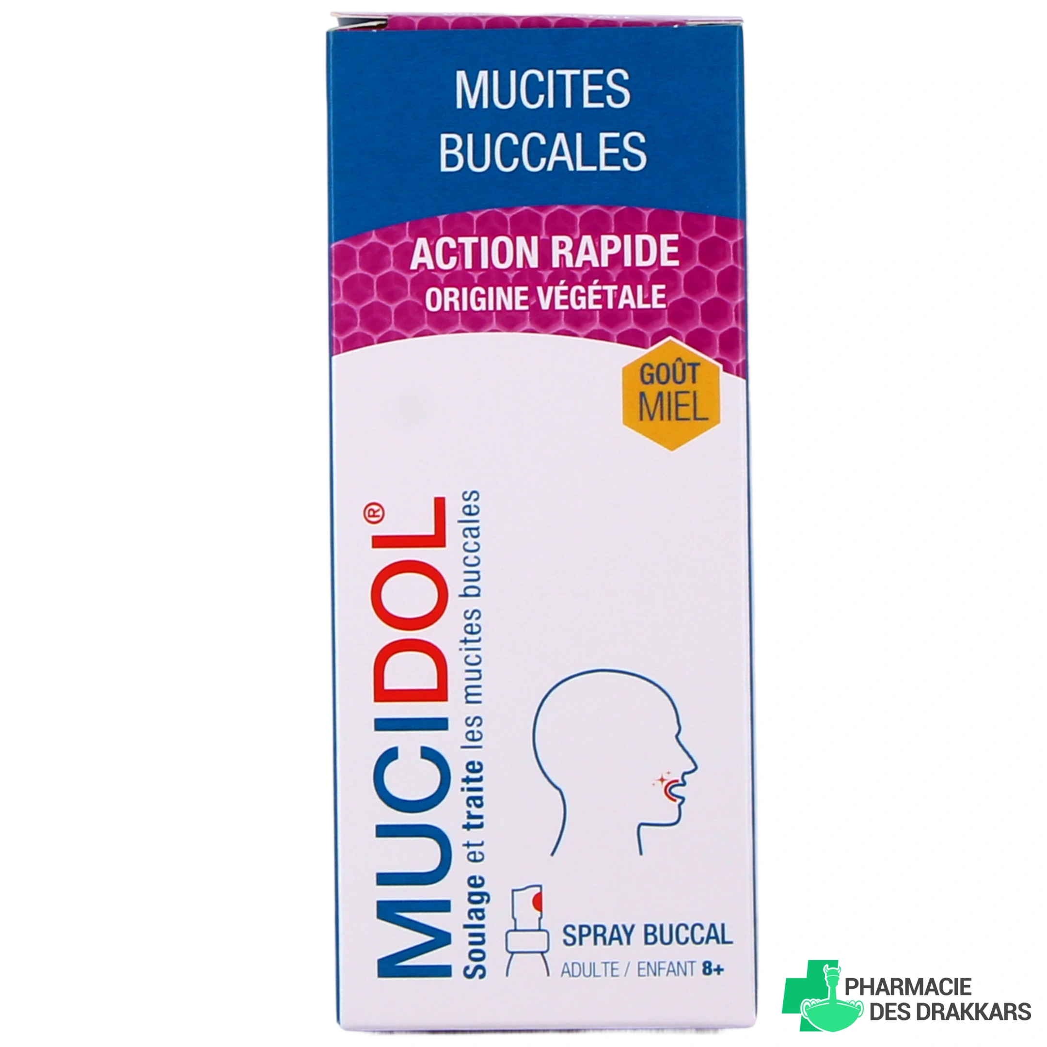 Agitez le flacon de Mucidol avant utilisation. Pulvérisez 4 à 5 fois dans la cavité buccale, 3 à 4 fois par jour. Précautions d'emploi :- Ne pas utiliser chez les enfants de moins de 8 ans.