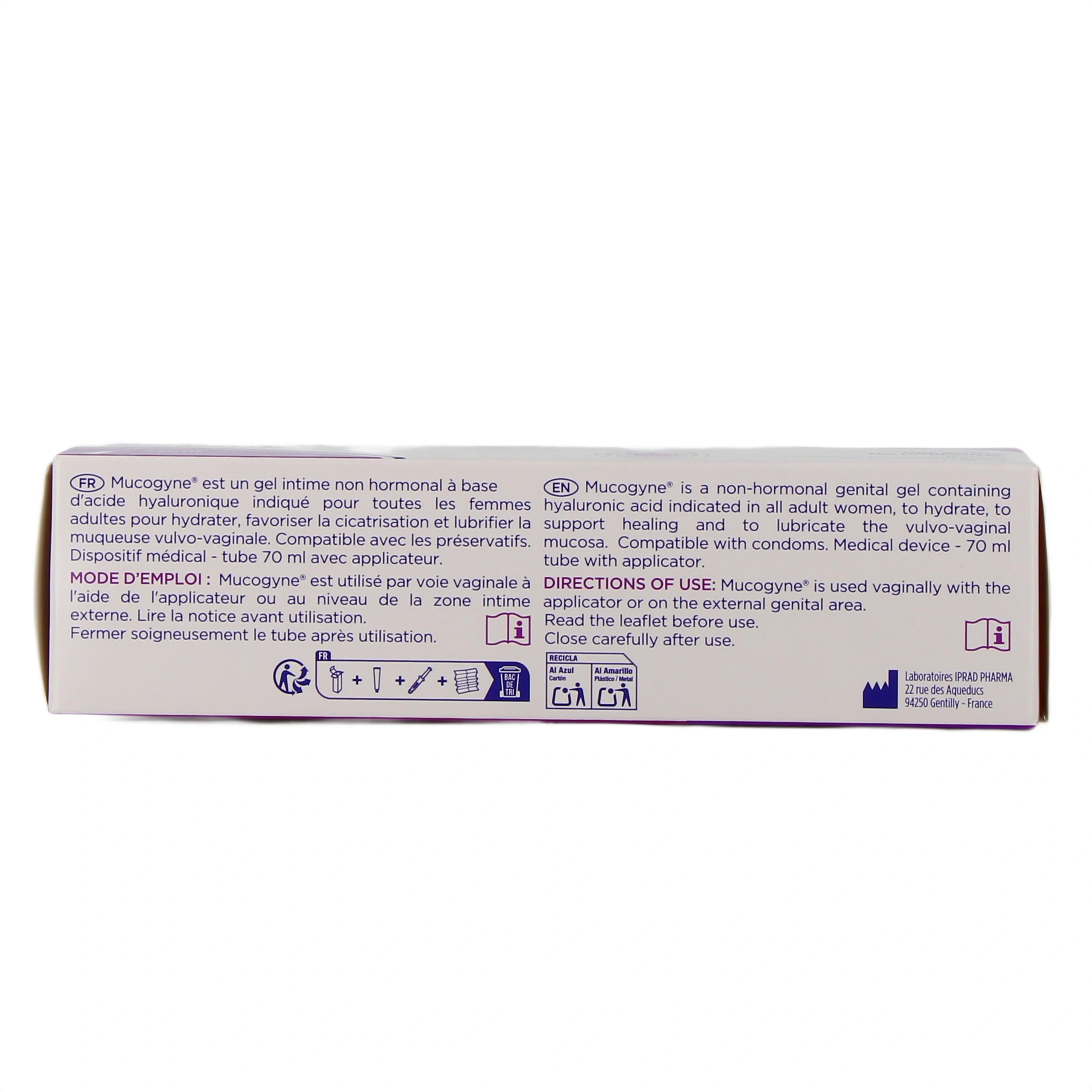 Présentations proposées sur votre pharmacie en ligne pour le gel intime Mucogyne : Tube de 40 ml - Tube de 70 ml - Boîte de 8 unidoses.