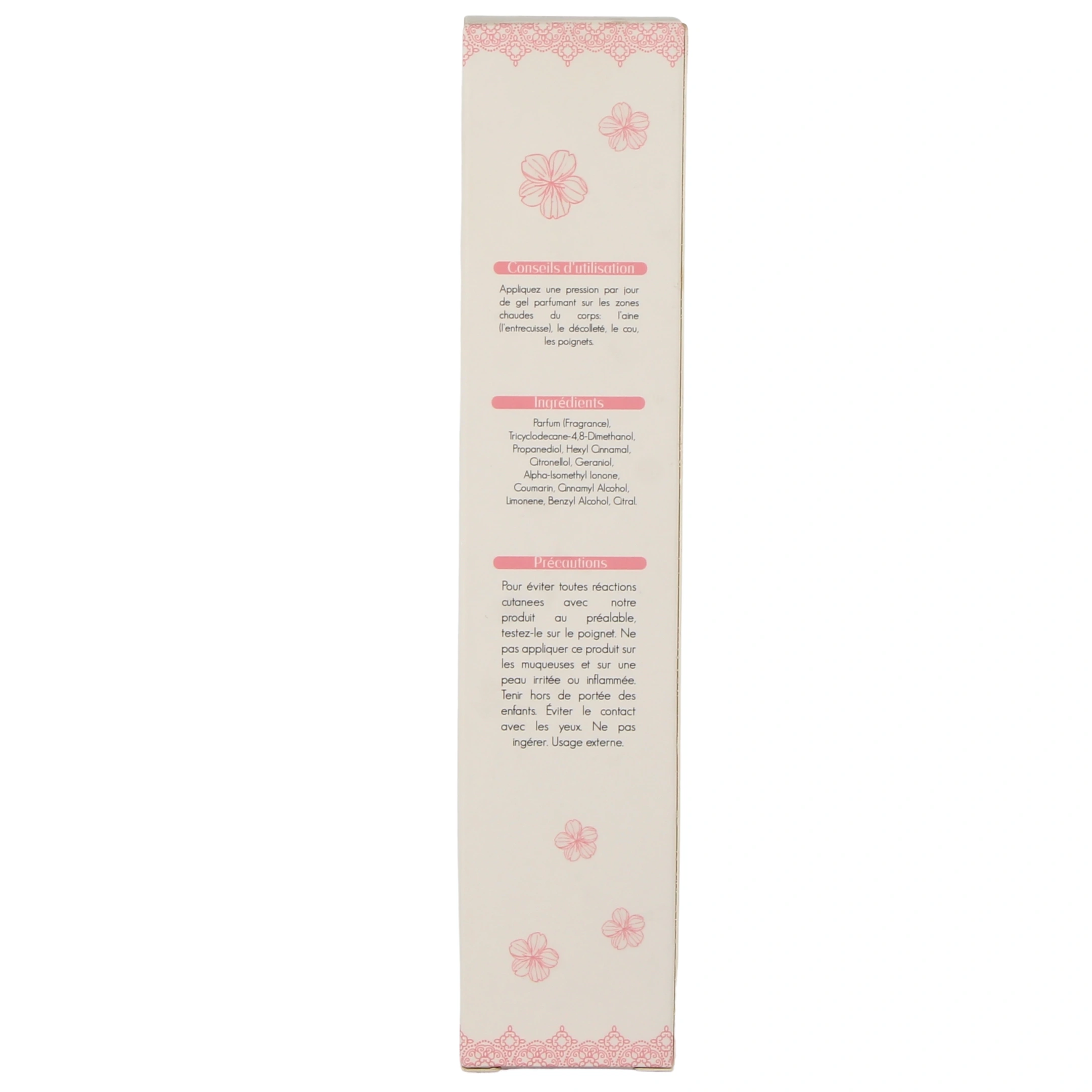 Précautions d'emploi : Ne pas appliquer sur ou à l'intérieur des muqueuses, mais autour des zones chaudes du corps. Femmes enceintes ou désireuses de l'être, femmes allaitantes ou ménopausées : demander conseil à un médecin. Comme tout produit cosmétique, effectuer un test de sensibilité à l'intérieur du poignet avant l'utilisation. Testé dermatologiquement - Fabriqué en France