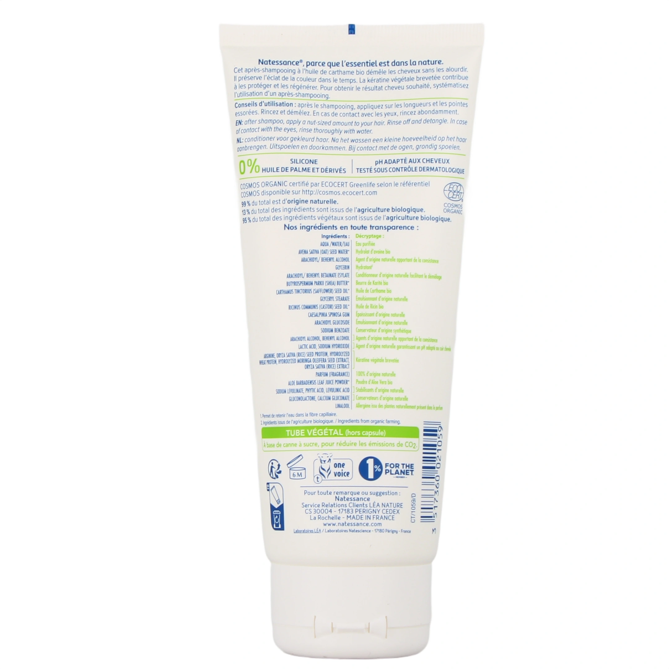 L'après-shampooing couleur Carthame Bio et Kératine Végétale Natessance a été spécialement conçu pour démêler et nourrir les cheveux colorés et méchés. La kératine végétale composant l'après-shampooing couleur Natessance va permettre de renforcer le cheveu tout en le protégeant. Elle va agir sur les brèches du cheveu pour lui apporter toutes ses propriétés revitalisantes et réparatrices. Ainsi, les cheveux sont rééquilibrés, renforcés et protégés des agressions extérieures qu'ils subissent au quotidien. Dans toute sa gamme capillaire, Natessance a choisi la kératine végétale, une combinaison brevetée de protéines de moringa, blé, riz et arginine. Riche en acides gras insaturés, l'huile de Carthame possède des propriétés nourrissantes et hydratantes. En nourrissant les cheveux secs en profondeur, l'huile de Carthame les rend brillants et souples. La Kératine végétale brevetée contribue à les protéger et les régénérer.