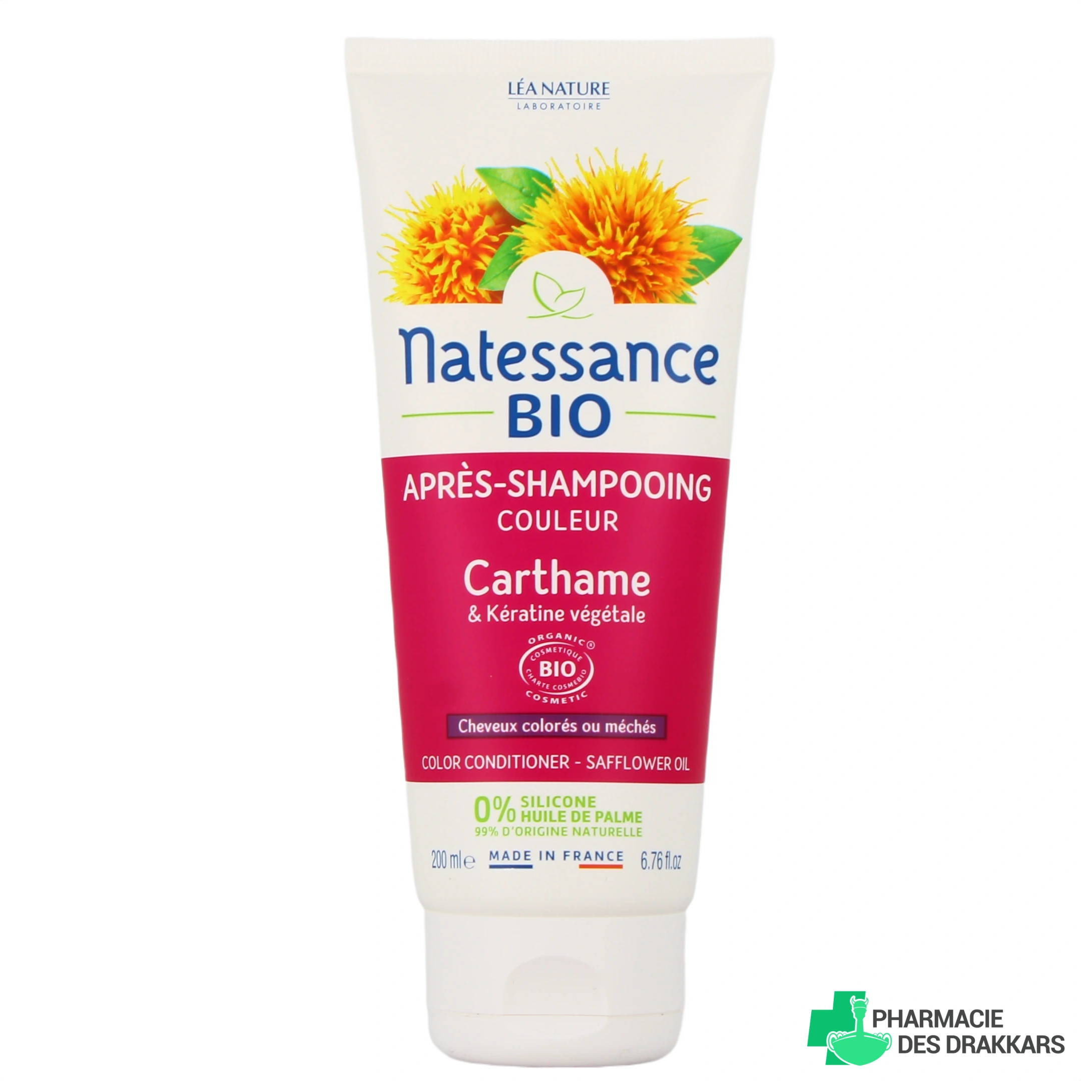 Conditionnement proposé par votre pharmacie en ligne pour l'après-shampooing couleur Carthame Bio et Kératine Végétale Natessance : tube de 200 ml.