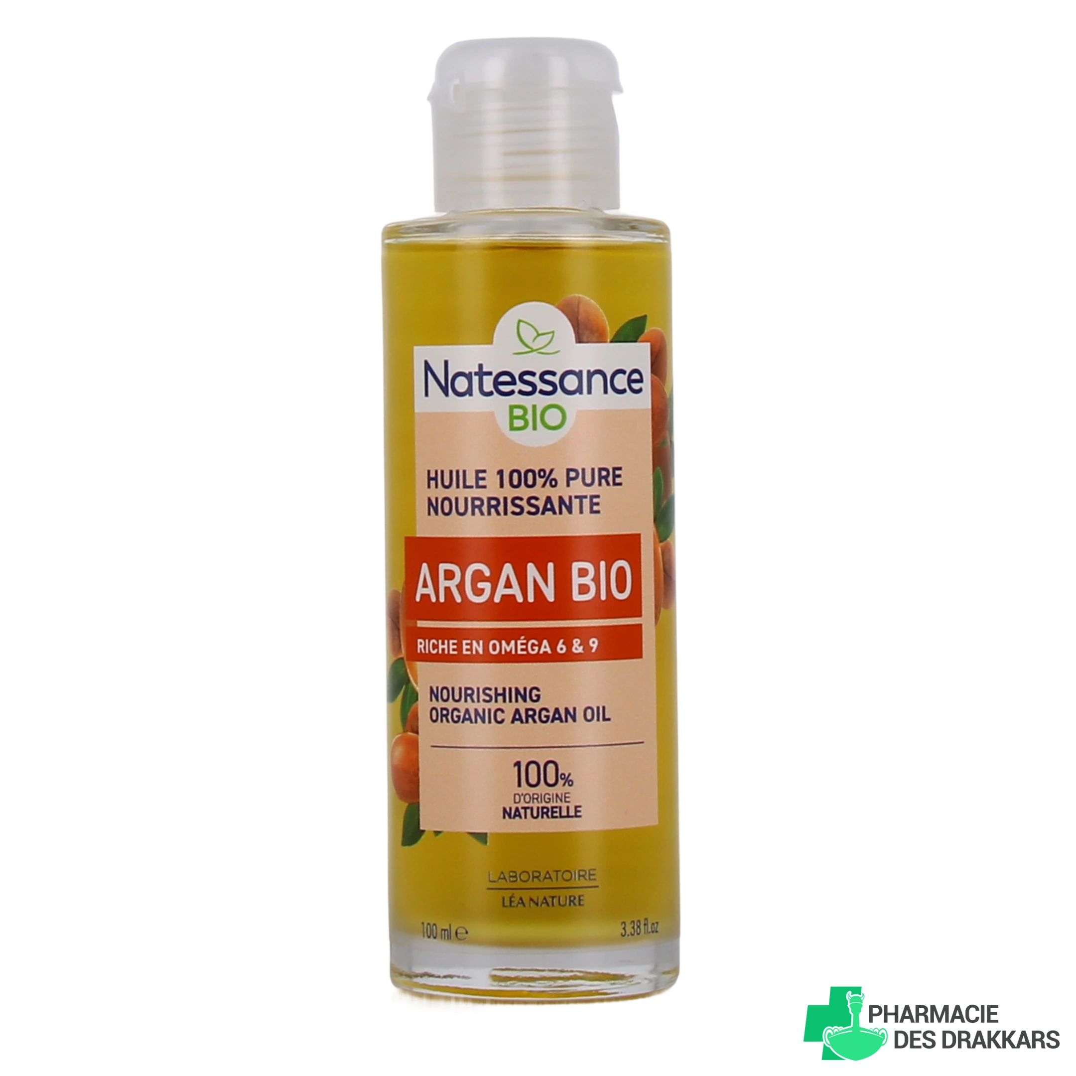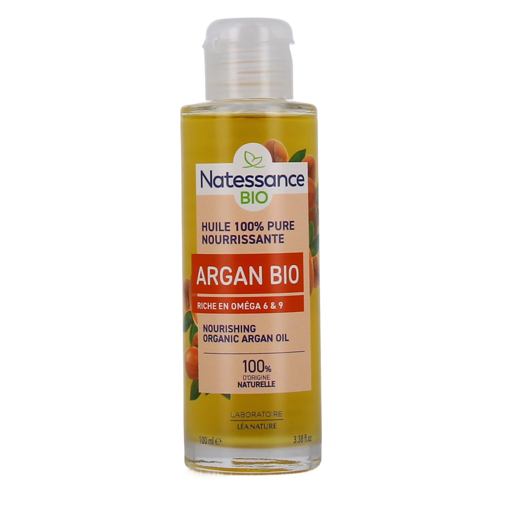 Conditionnement proposé par votre pharmacie en ligne : flacon de 50 ml ou 100 ml d'huile d'argan bio équitable Natessance.