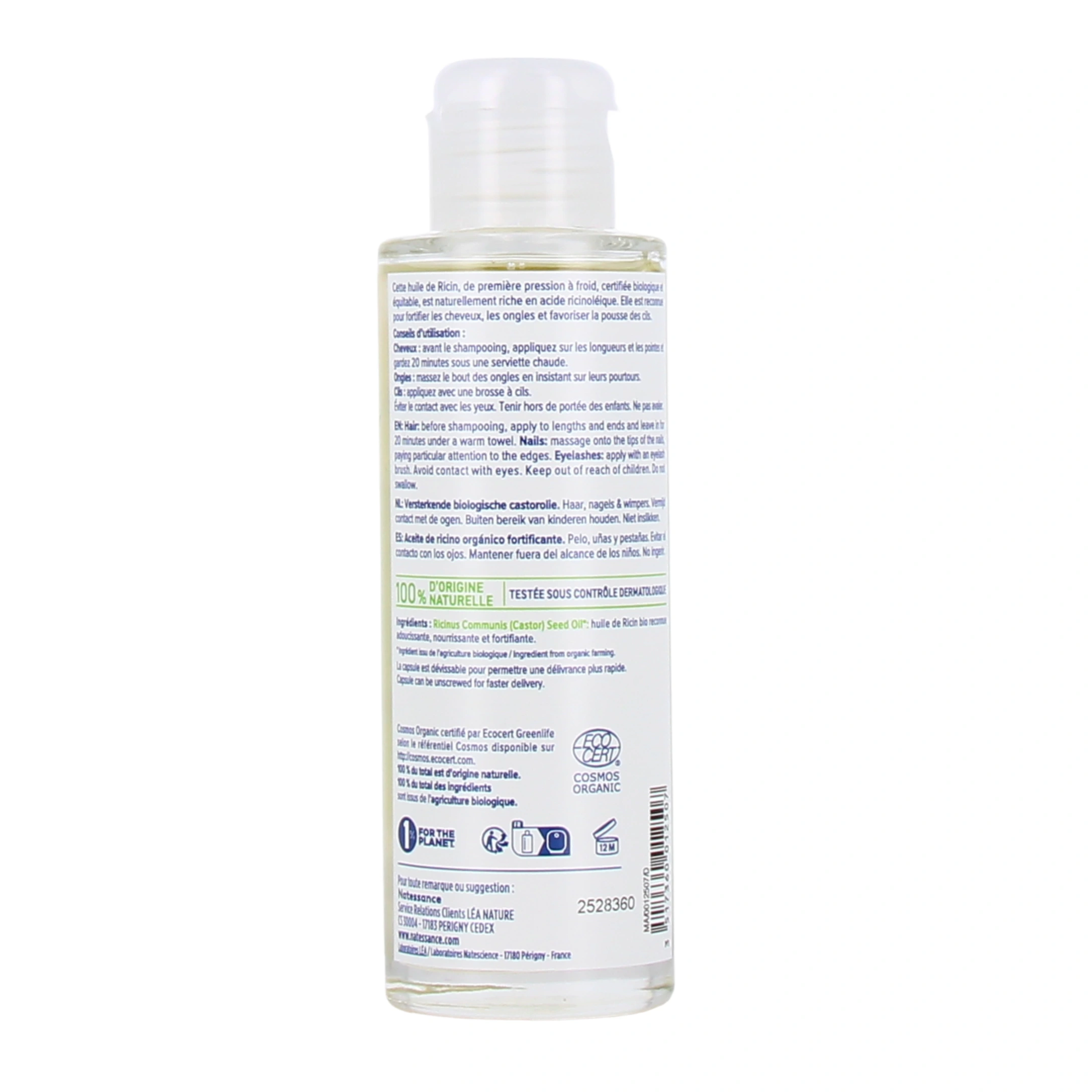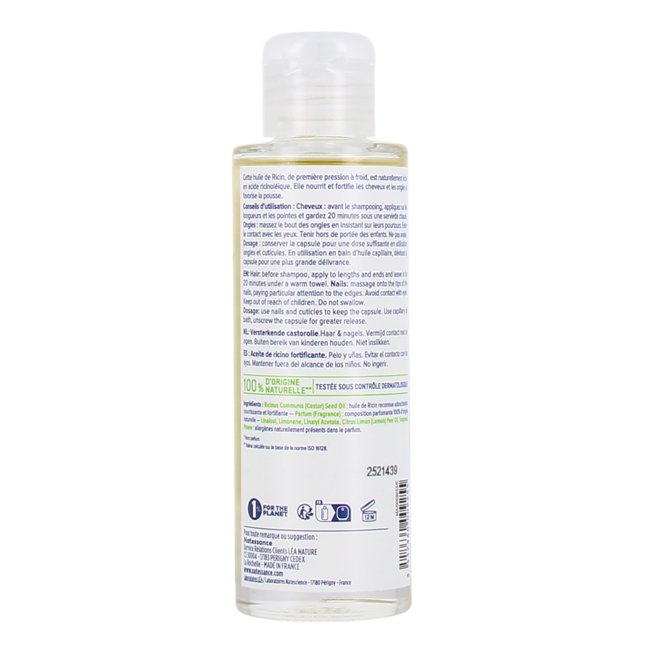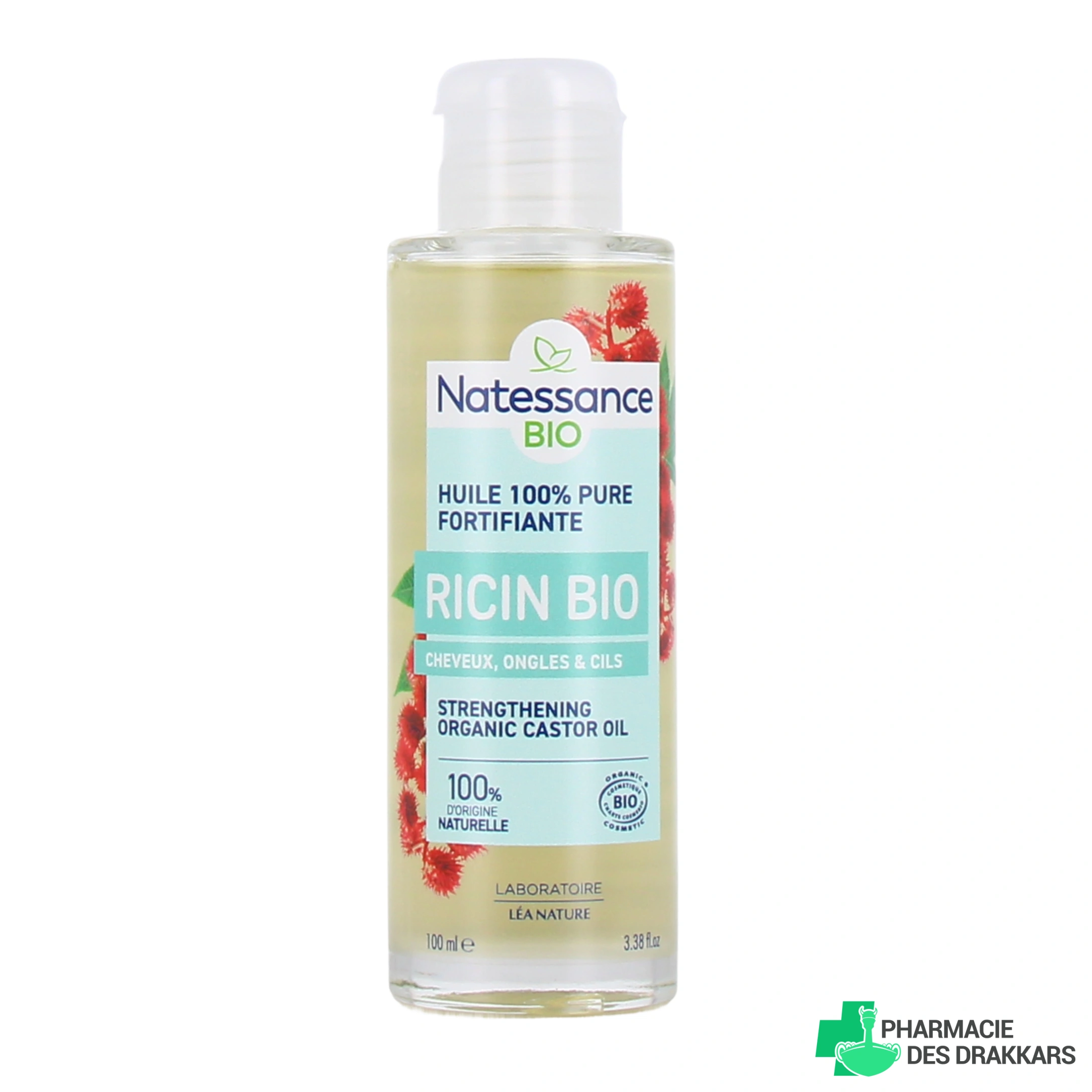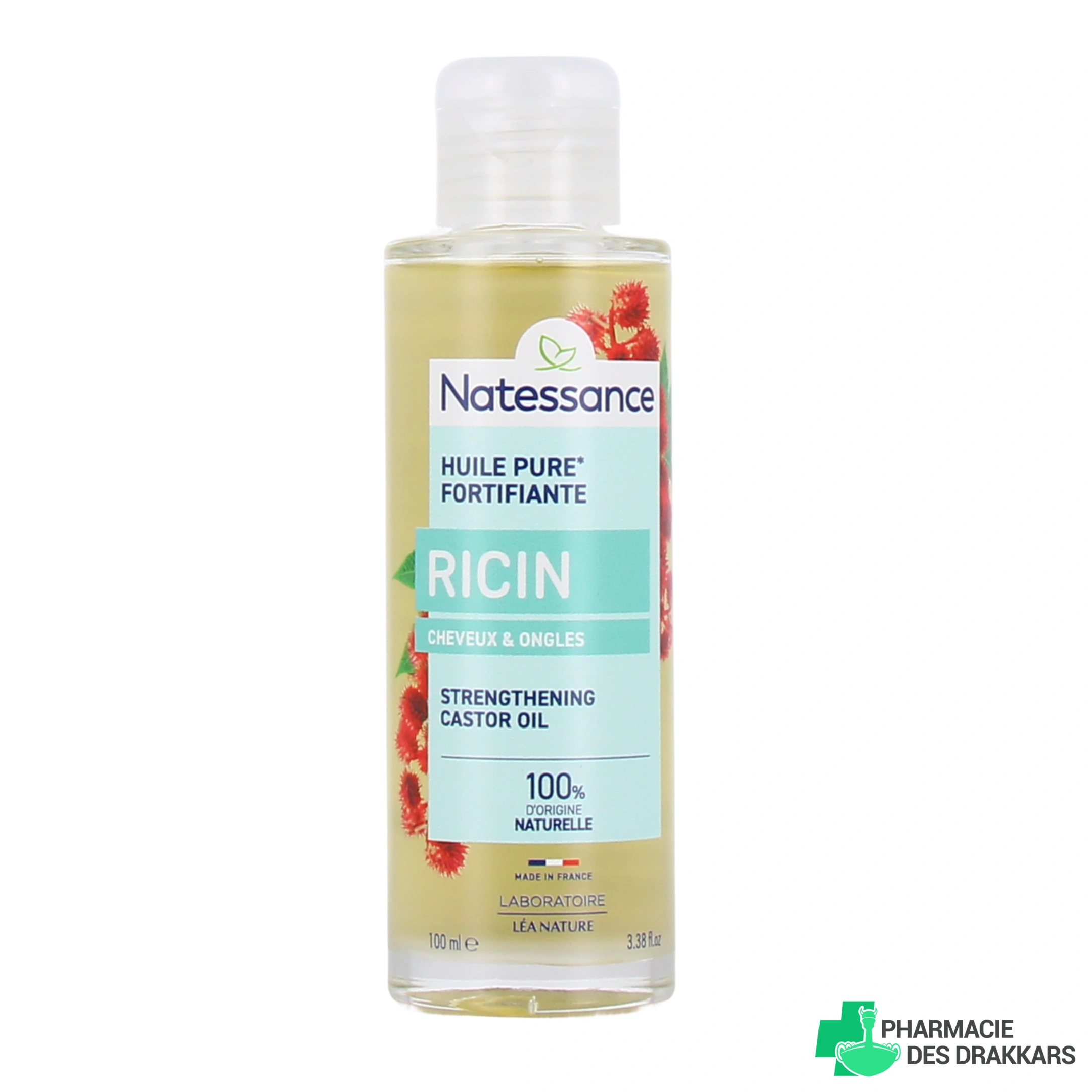 Cette huile Natessance 100% pure peut être utilisée en soin capillaire nourrissant et régénérant mais également en fortifiant pour les ongles. Elle peut également favoriser la pousse des cils, des sourcils et des cheveux. L'huile de ricin fortifiante Natessance contribue au maitien d'un taux d'hydratation optimal au niveau du cuir chevelu tout en favorisant la brillance et la souplesse de la chevelure.