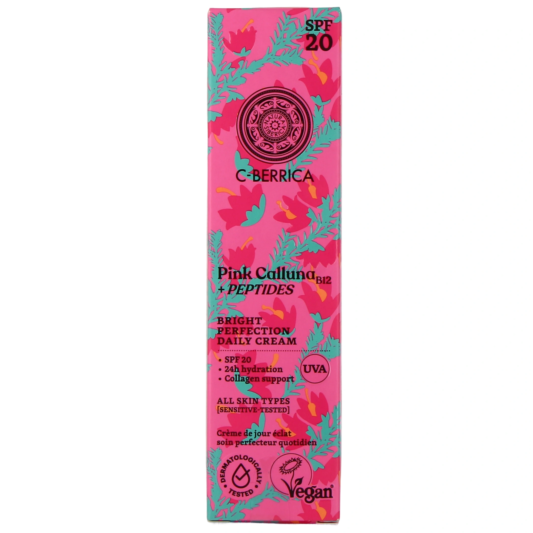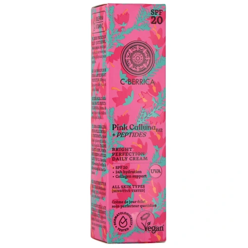Répondez aux besoins de votre peau aujourd'hui, pour préserver et prolonger sa santé et sa beauté de demain ! La crème de jour Perfection Éclat C-Berrica SPF20 de Natura Siberica a en effet été élaborée non seulement en tant que soin hydratant, mais aussi comme un bouclier quotidien avancé conçu pour répondre aux exigences des peaux de toutes les femmes, notamment pour celles qui cherchent à prévenir le relâchement et les autres signes de l’âge. Ce soin dermatologique vous apporte par ailleurs une légère protection solaire (SPF 20), afin d’agir sur tous les aspects et de vous aider à maintenir un teint uniforme, lisse et durablement lumineux.