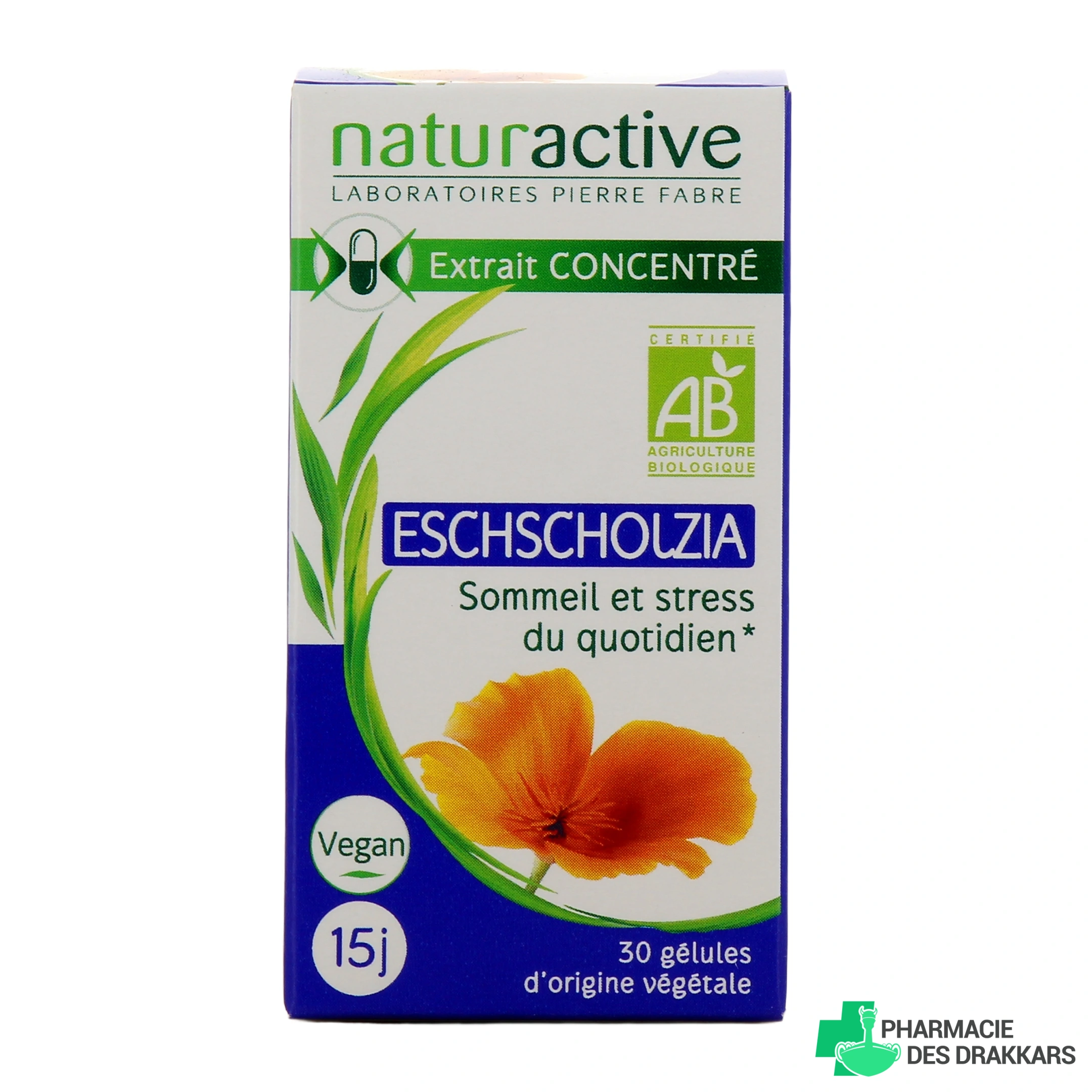 Le complément alimentaire Naturactive Eschscholtzia Bio est à retrouver dans les présentations suivantes chez Pharmacie des Drakkars : boîte de 30 gélules d'origine végétale.