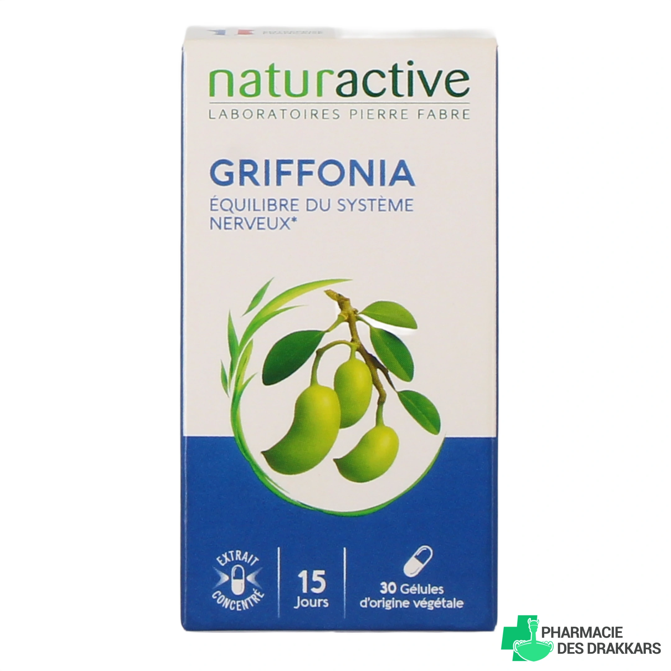 Présentation proposée par votre pharmacie en ligne Drakkars pour Naturactive Griffonia : boîte de 30 gélules.
