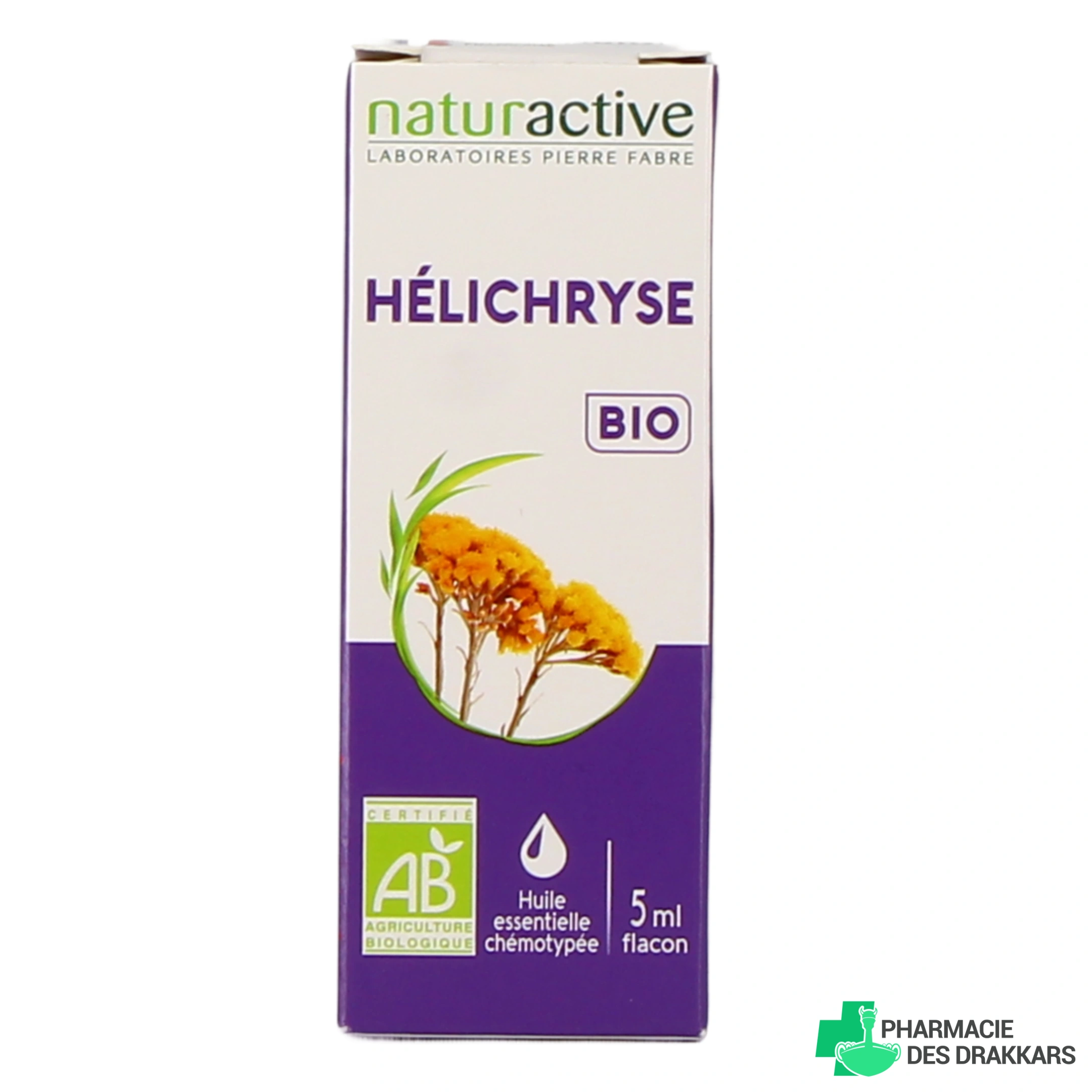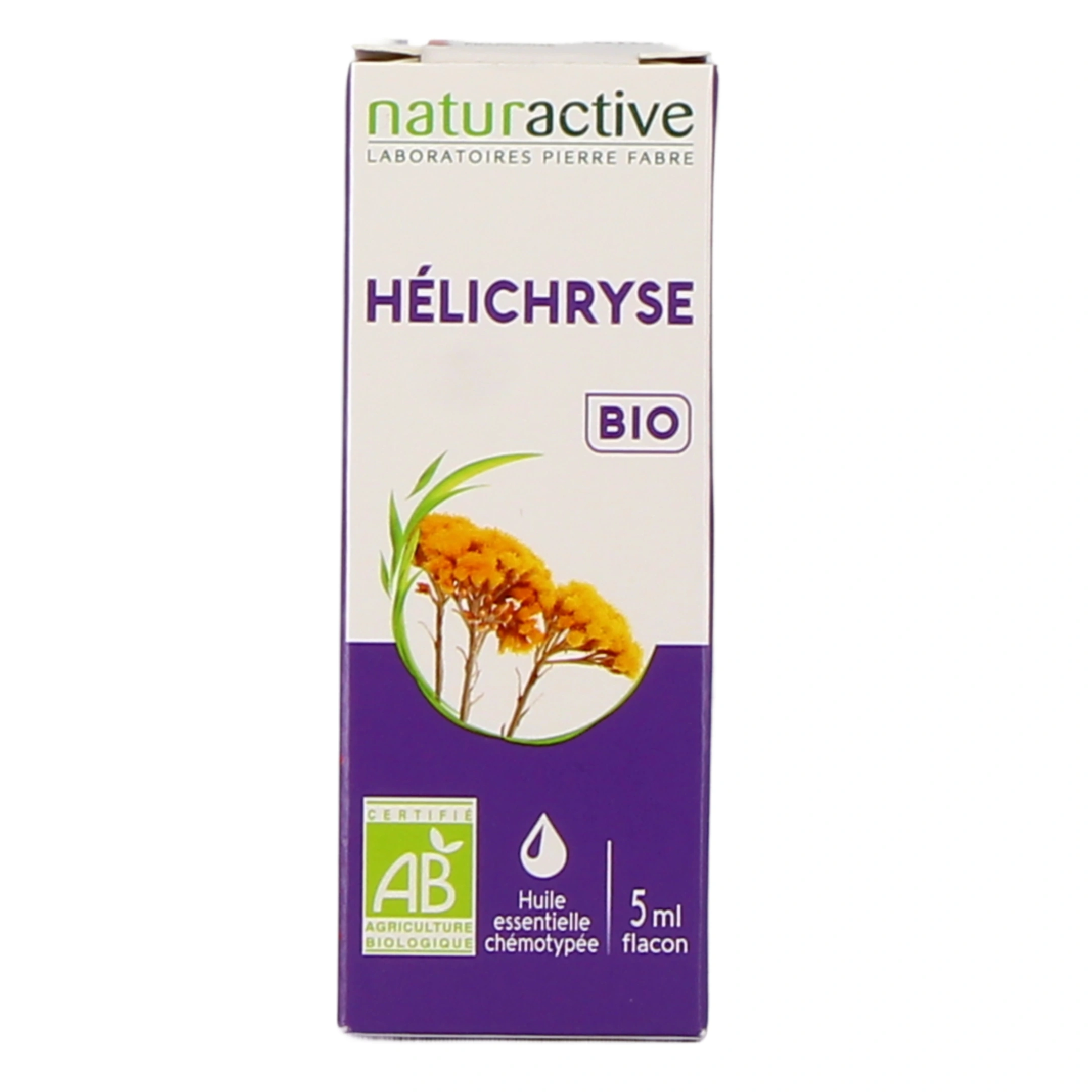 Présentation disponible sur notre pharmacie en ligne pour l'huile essentielle hélichryse Naturactive : flacon de 5 ml.