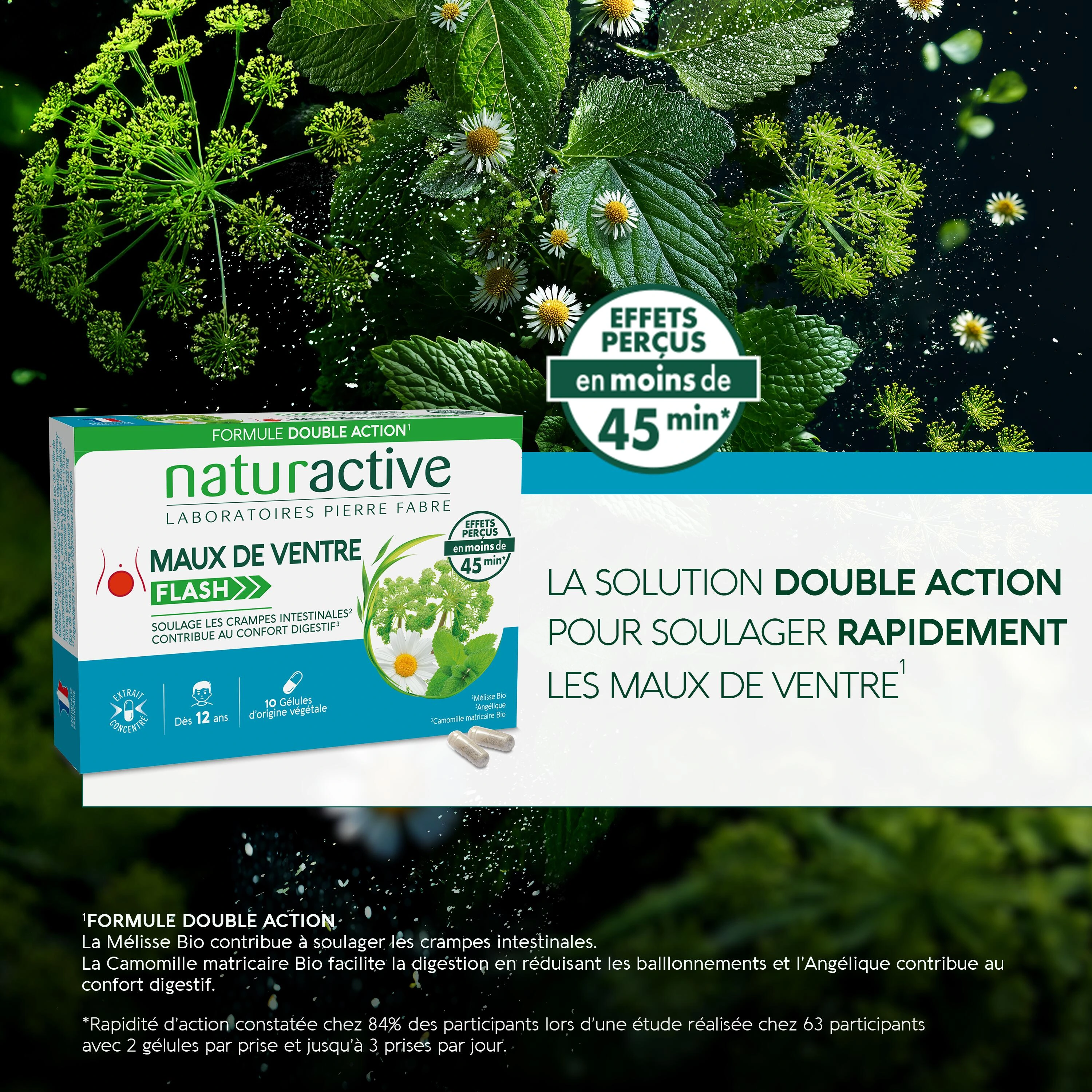 Le complément alimentaire Naturactive maux de ventre flash s'utilise dès les premiers signes de maux de ventre chez les adultes et les enfants de plus de 12 ans. Ses effets sont perçus en moins de 45 minutes.