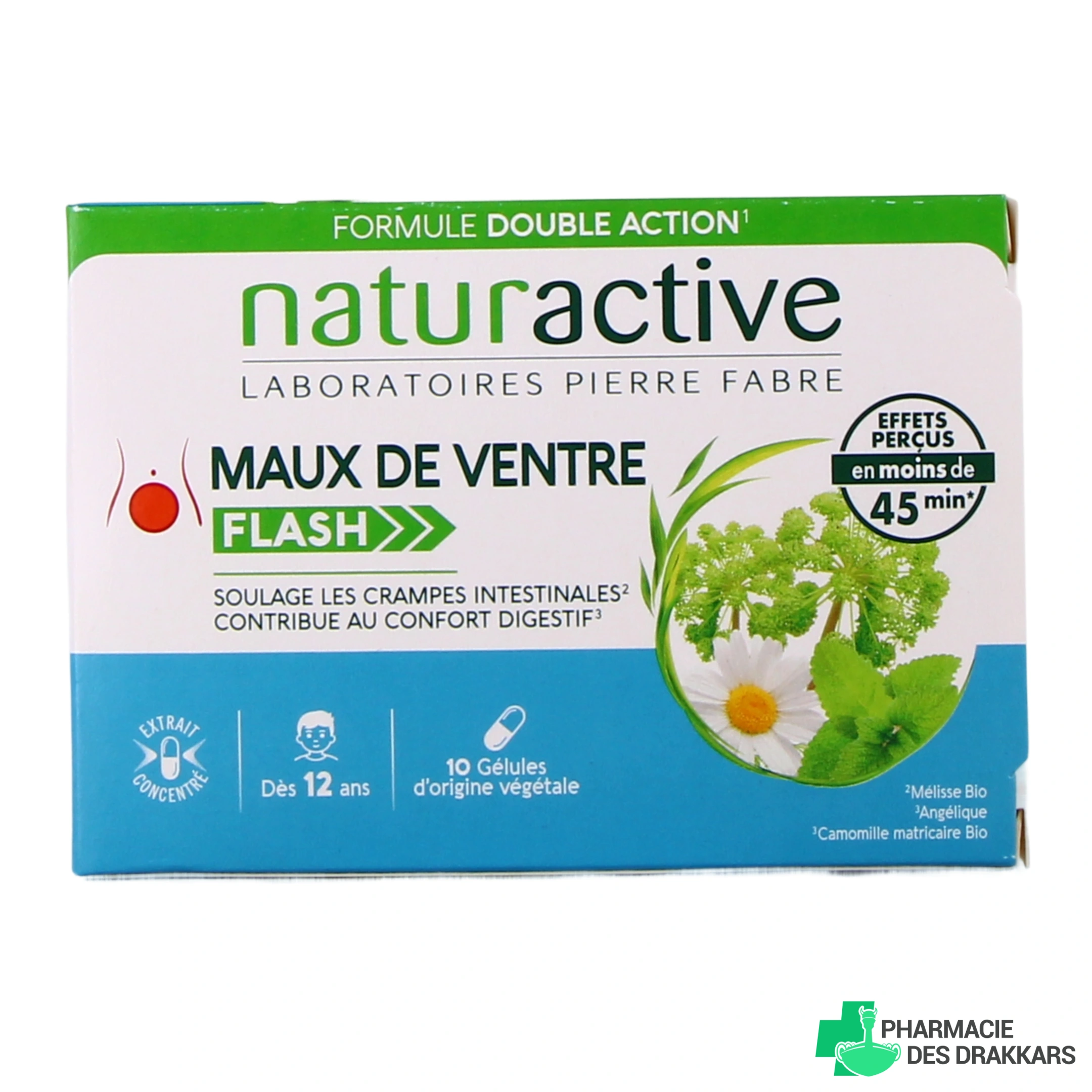 Conditionnement proposé par notre pharmacie en ligne pour Naturactive Maux de Ventre Flash : boîte de 10 gélules.