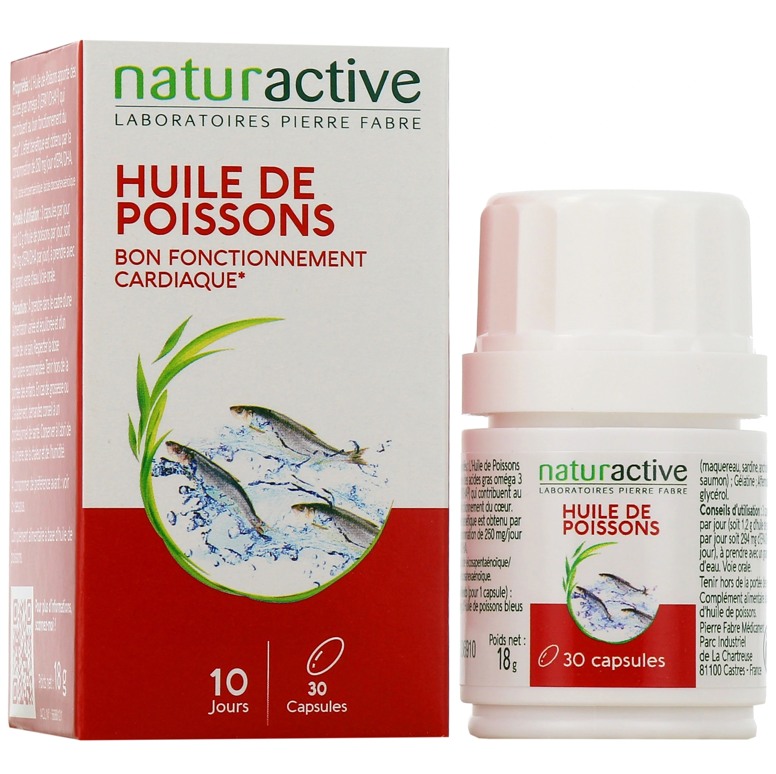 Naturactive Poissons est un complément alimentaire formulé à base d'huile de poissons. Cette huile de poissons apporte à l'organisme des acides gras oméga-3 qui contribuent au bon fonctionnement du cœur.