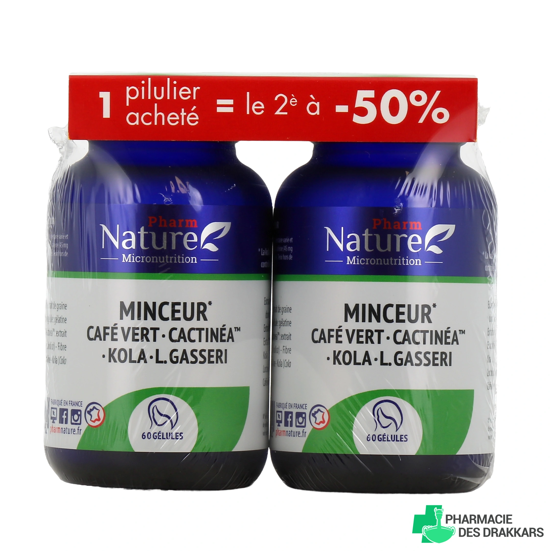 Destiné au contrôle du poids, Pharm Nature Minceur est formulé avec des extraits de café vert, de guarana, de figuier de Barbarie (Cactinéa) et de kola. Cette dernière aide à favoriser l'amincissement : elle contribue au contrôle du poids corporel et aide à brûler les graisses. La souche Lactobacillus gasseri complète la formule de Pharm Nature Minceur. Elle est dosée à 3 milliards d'UFC par portion journalière.