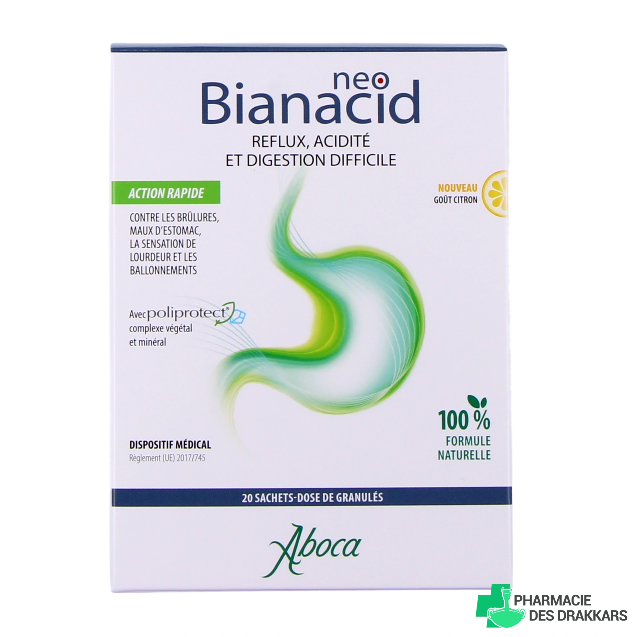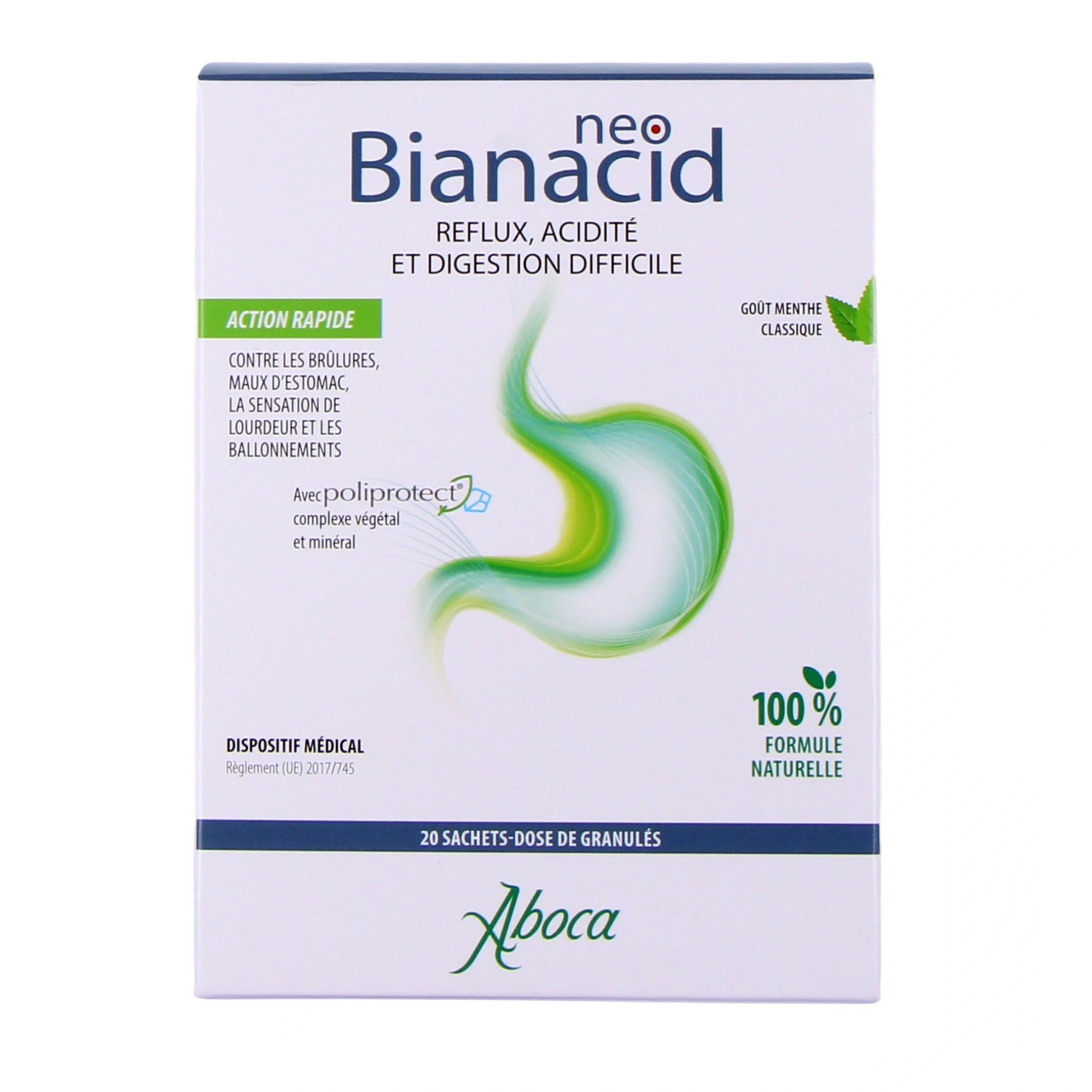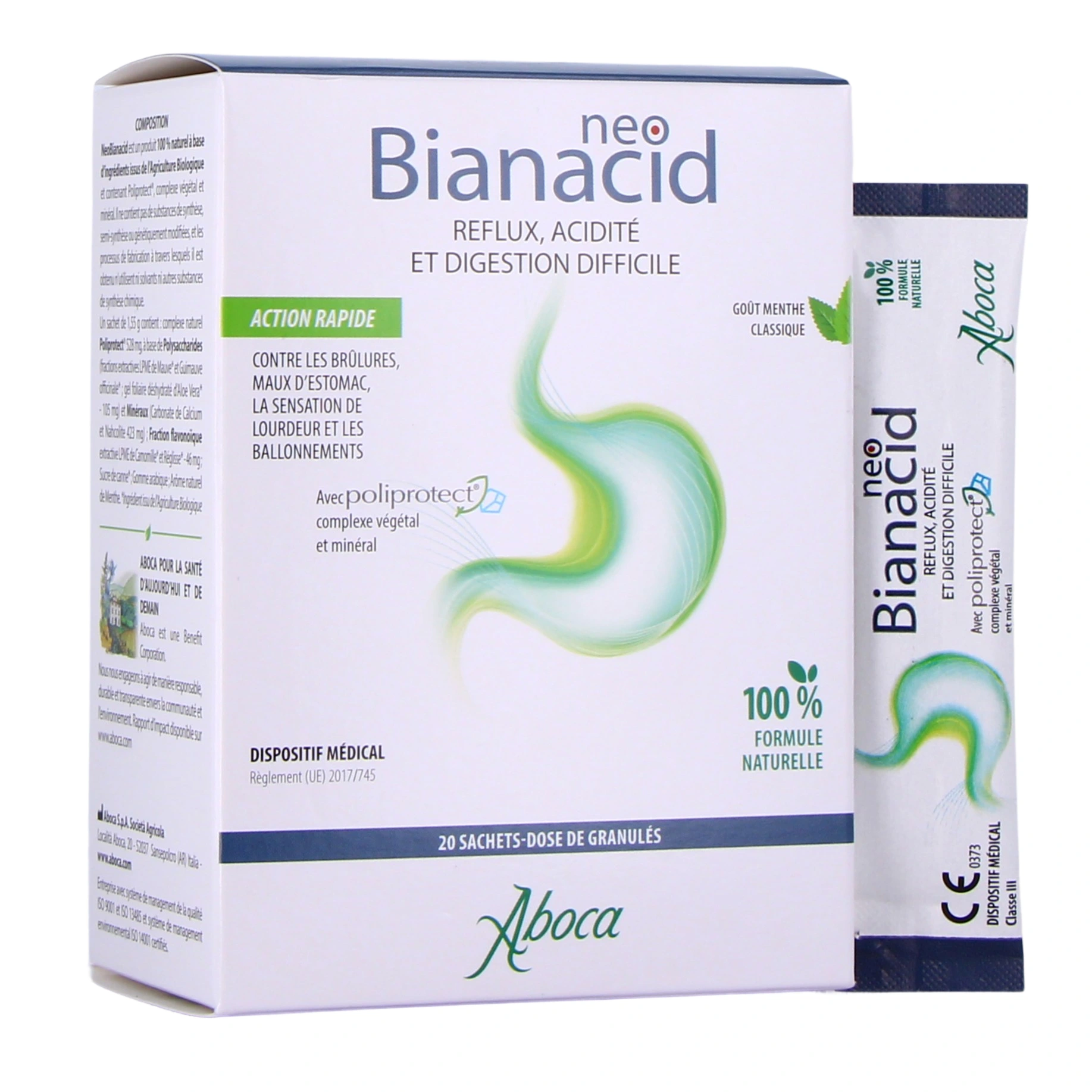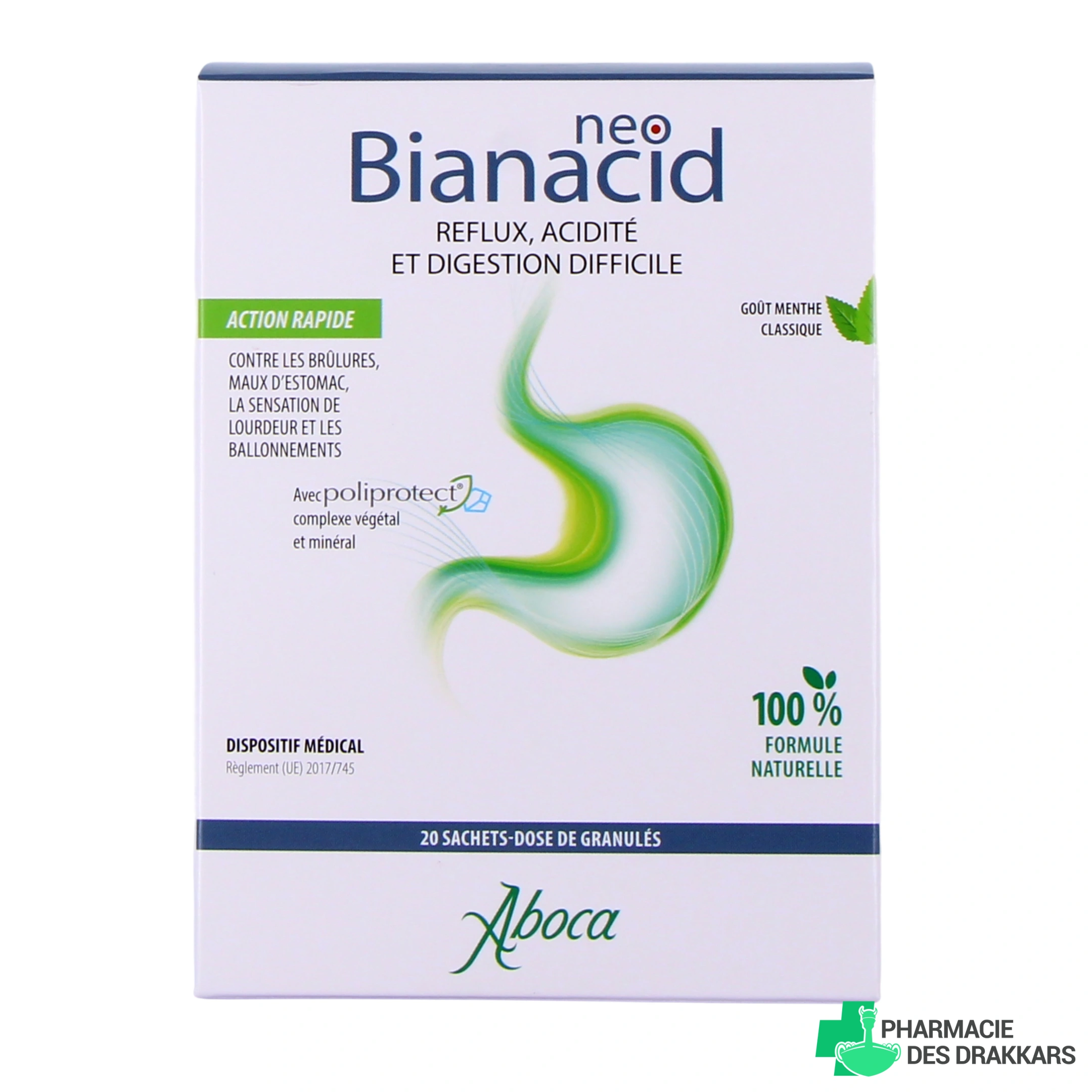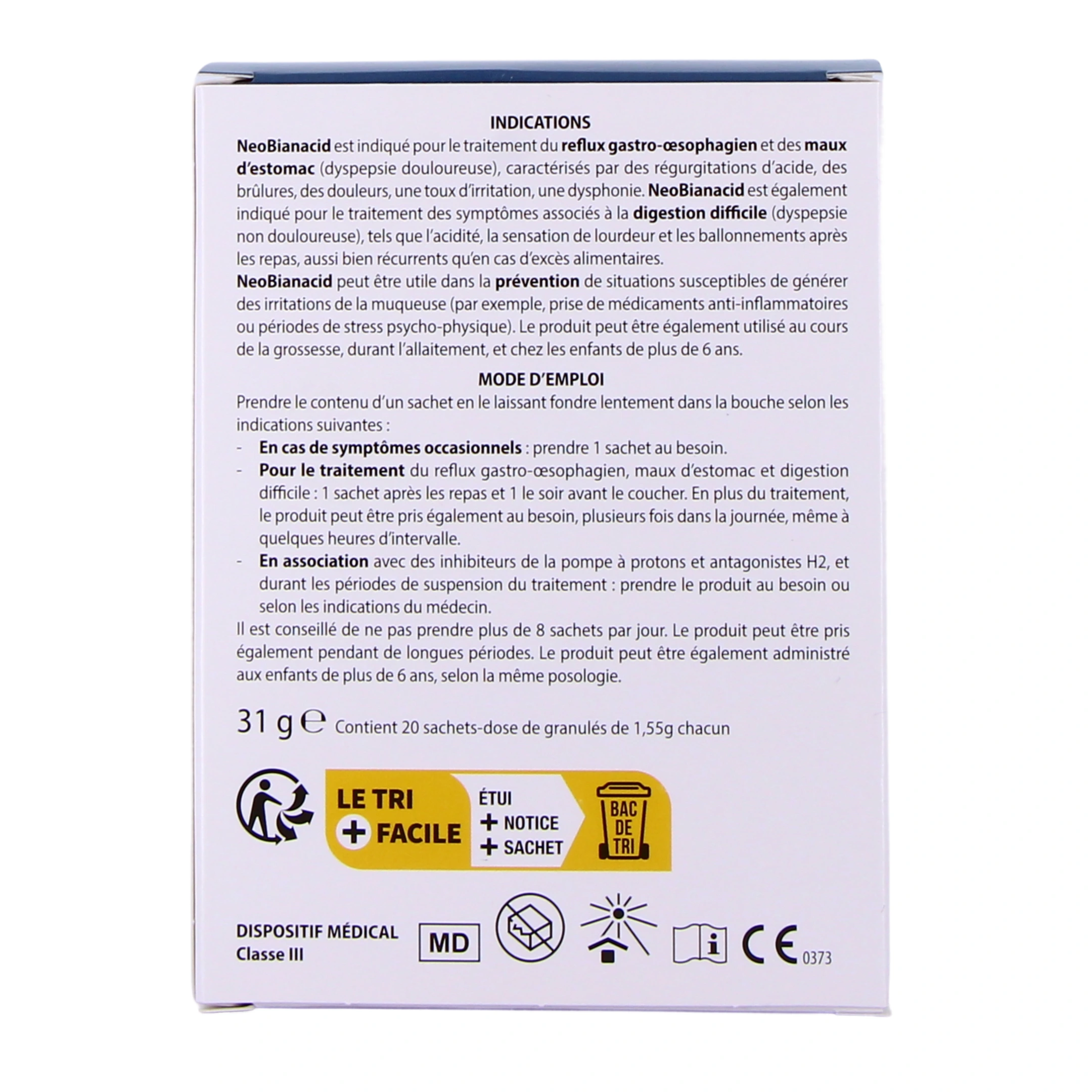 NeoBianacid traite les troubles liés à l'acidité tels que les brûlures, maux d'estomac, reflux gastro-œsophagien, gastrite, dyspepsie (digestion difficile) ainsi que les sensations de lourdeur et météorisme.