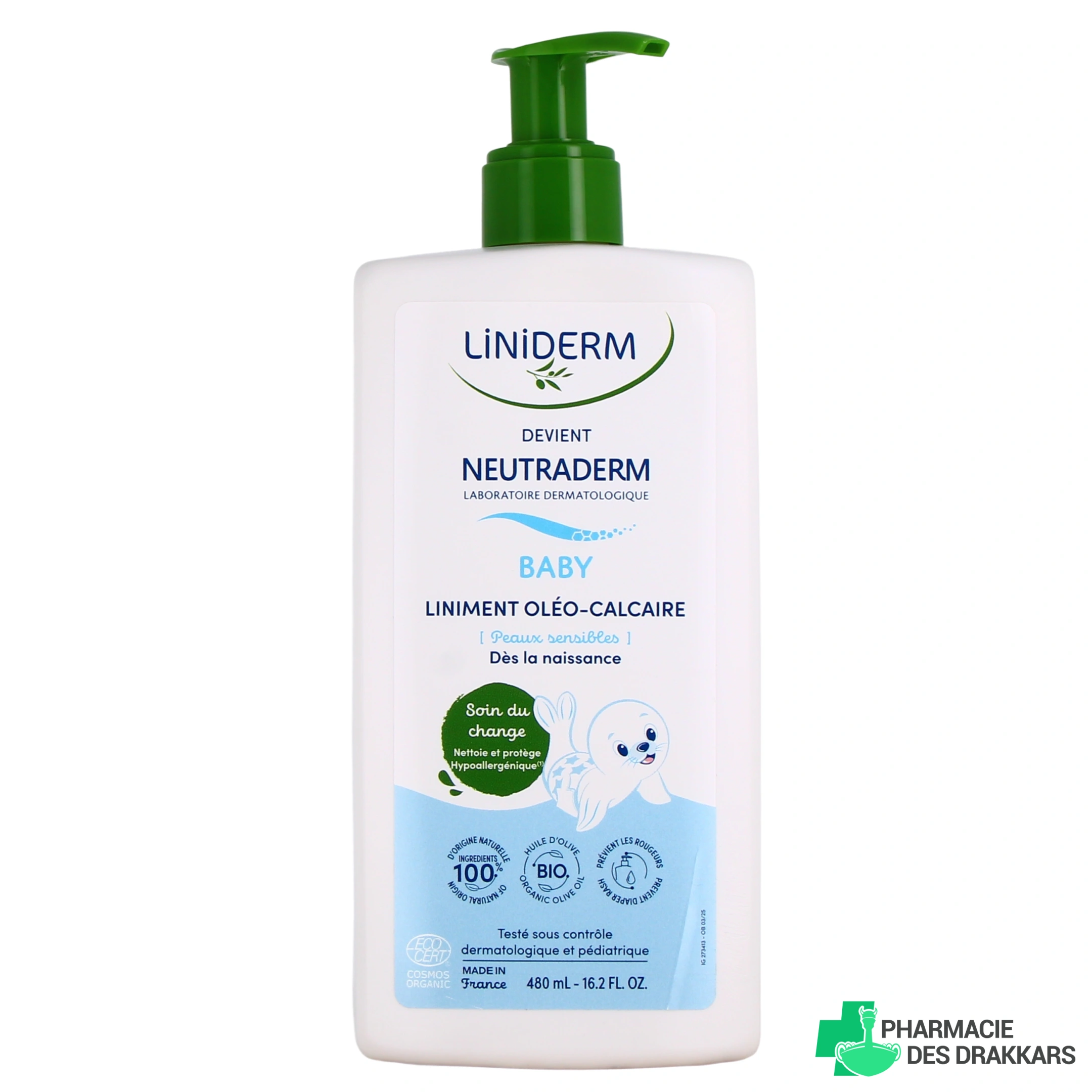 Les présentations proposées par votre Pharmacie des Drakkars pour le liniment oléo-calcaire Neutraderm Bio de Gilbert : flacon de 100 ml, de 250 ou de 480 ml ; flacon-pompe de 1 L.