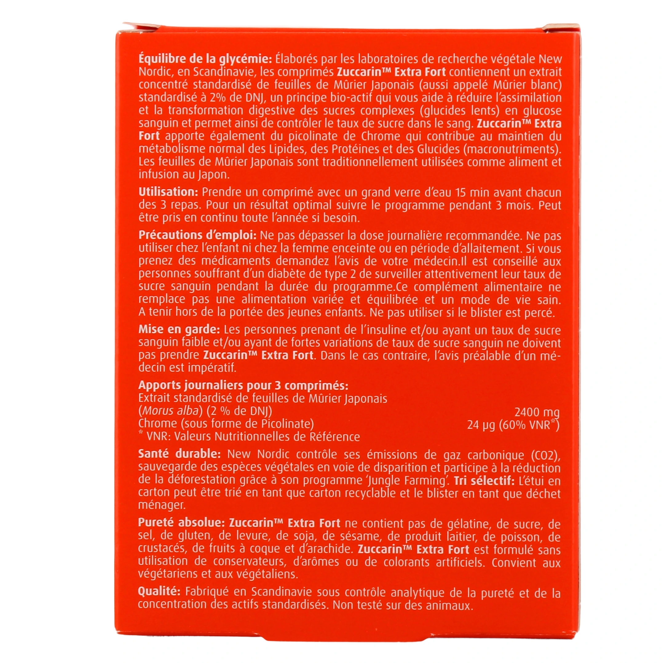 - Zuccarin Extra Fort : 2400 mg d'extrait concentré de feuille de Mûrier Blanc (Morus Alba) titré à 2% de DNJ (1-Déoxynojirimycine) et Chrome (sous forme de picolinate) 24 µg pour 3 comprimés.