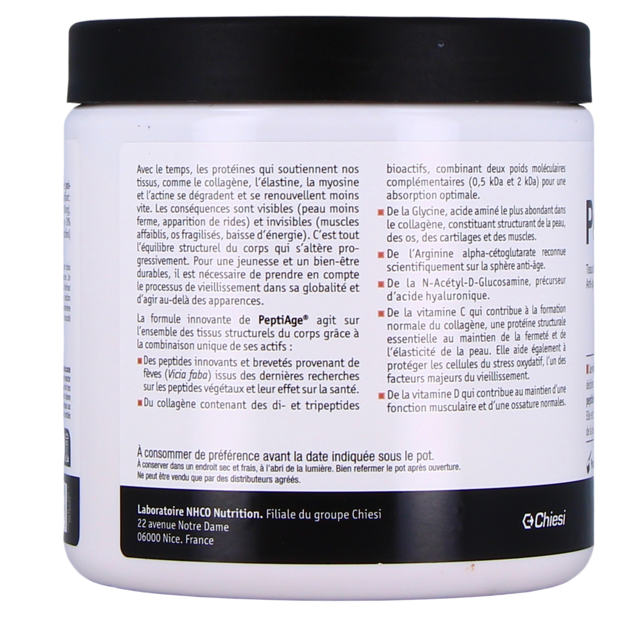 NHCO PeptiAge est un complément alimentaire anti-âge ayant pour but d'agir sur la peau, les articulations, les muscles et les os. Il repose sur une formule innovante qui associe des peptides brevetés, du collagène, un précurseur d'acide hyaluronique et de la glycine. Elle est riche en vitamine C pour la formation du collagène, pour le fonctionnement de la peau et des cartilages ainsi qu'en vitamine D pour le maintien des muscles et des os.