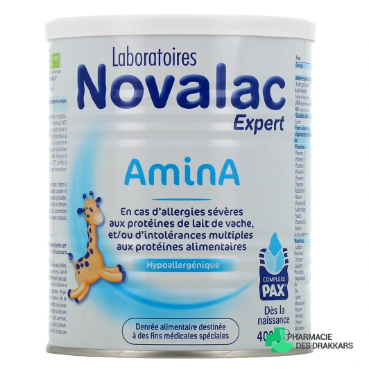 Novalac AminA est une denrée alimentaire destinée à des fins médicales spéciales. Il s'agit d'une préparation en poudre indiquée chez les bébés non allaités, dès la naissance, en cas d'allergies sévères aux protéines de lait de vache et/ou d'intolérances multiples aux protéines alimentaires.