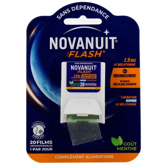 Novanuit Flash est un complément alimentaire proposé par le laboratoire Sanofi. Présenté sous forme de film orodispersible, il contient de la mélatonine pour réduire le temps d'endormissement.