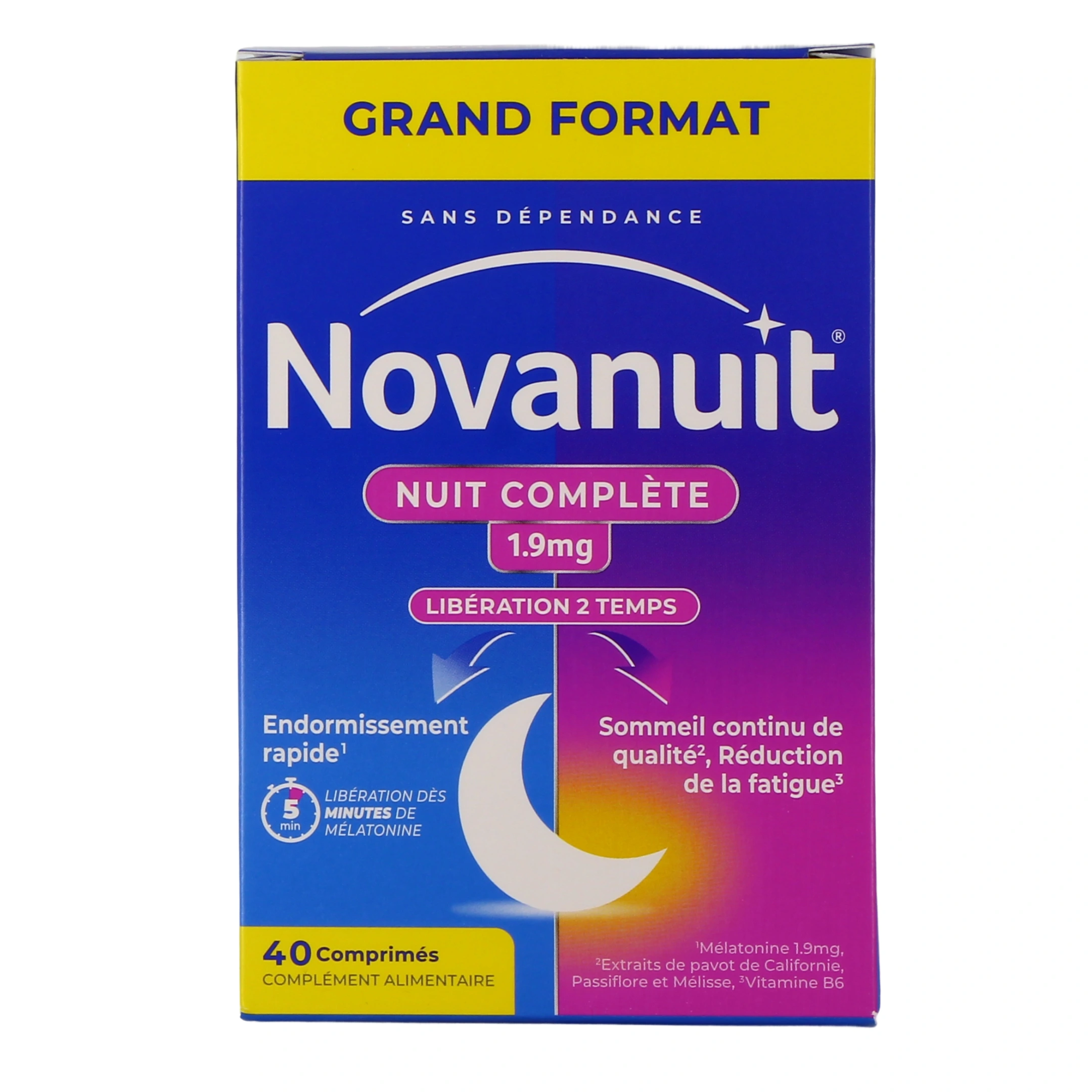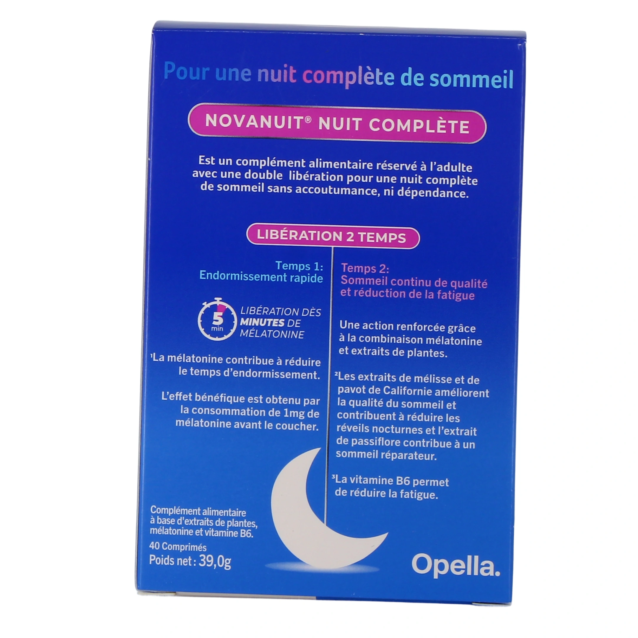 Novanuit Nuit Complète est un complément alimentaire à double libération pour une nuit complète de sommeil sans dépendance ni accoutumance. Sa formule renferme de la mélatonine, des extraits de pavot de Californie, de passiflore et de mélisse ainsi que de la vitamine B6.