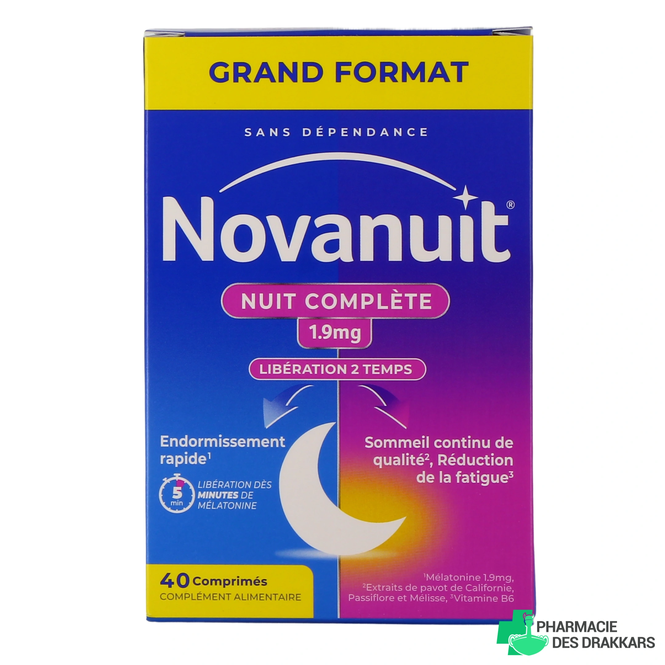 Présentation proposée par notre pharmacie en ligne pour Novanuit Nuit Complète : boîte de 20 ou de 40 comprimés.