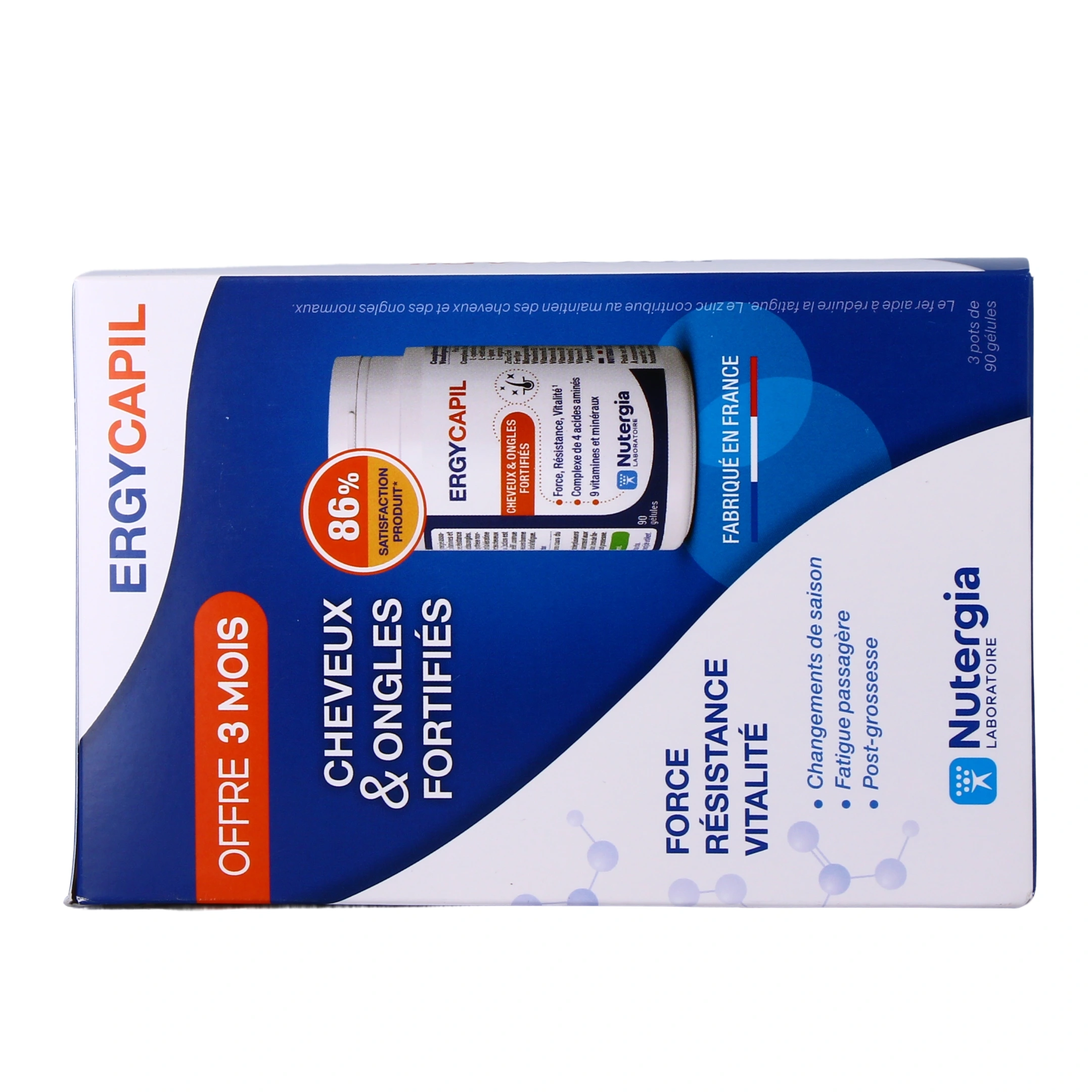 Présentation proposée pour Ergycapil Nutergia sur notre pharmacie en ligne : Pack contenant 3 piluliers de 90 gélules pour une cure de 3 mois.